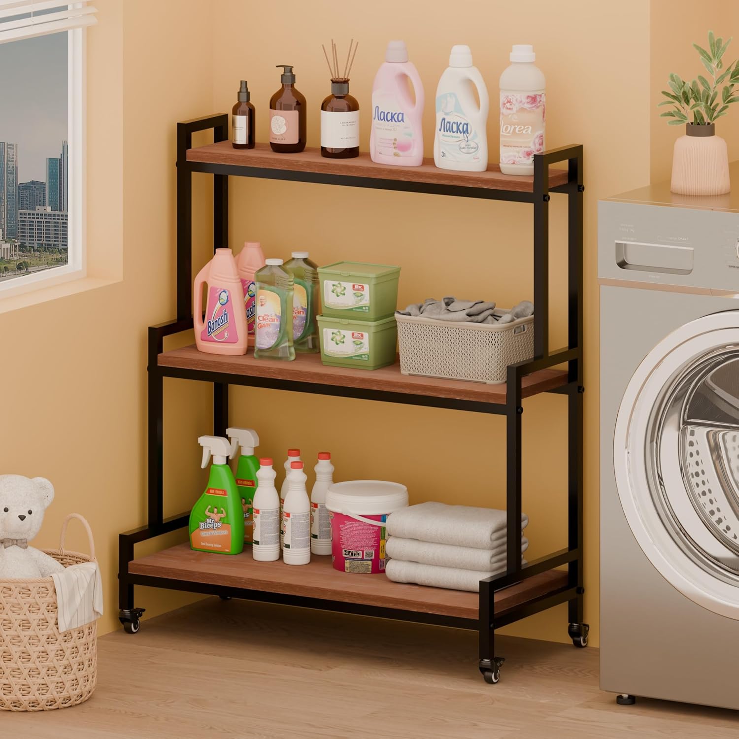 Rustic Plant Stand with Wheels 37“ H, Rolling Plant Shelves Rack Indoor Outdoor,Metal Plant Stand with Solid Wood for Multiple Plants,Industrial Ladder Plant Flower Shelf for Garden,Living Room,Brown