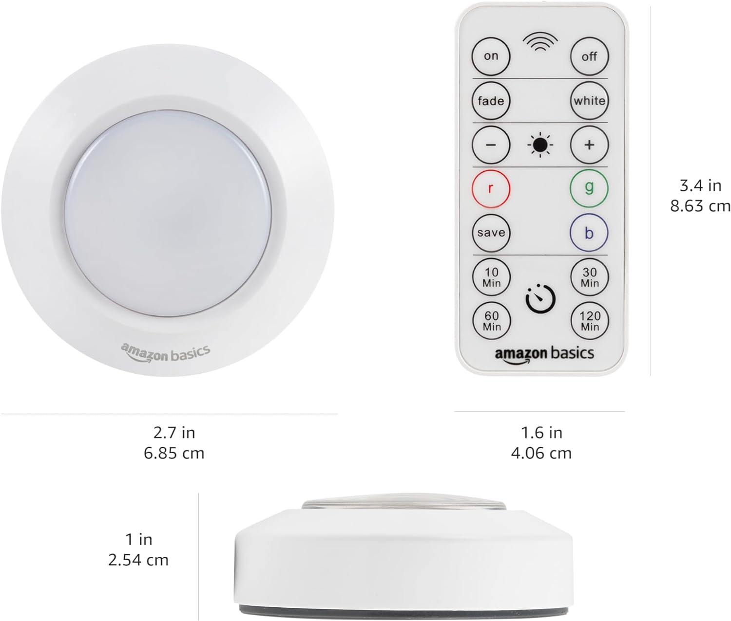 Amazon Basics LED Puck Lights, Color Changing, Battery Operated, IR Remote, 40 Lumens, 2 Pack, Wireless Stick on Lights, Under Cabinet Lighting, Ideal for Closets, and More, White