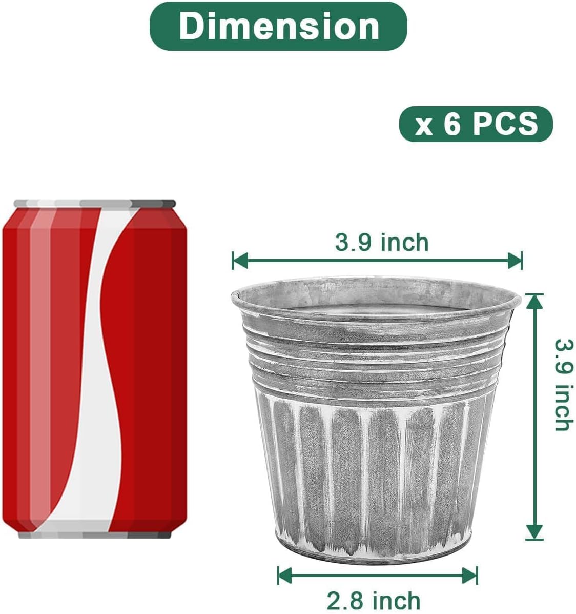 - 【Size of Metal Flower Pots】There are 6pcs metal planters in a package. The topper opening diameter 3.9 inches, the bottom diameter 2.8 inches, and the barrel height is 3.9 inches. These tin buckets have ample space for plant growth, making them ideal for succulents, herbs, and flowers, keeping your greenery vibrant.