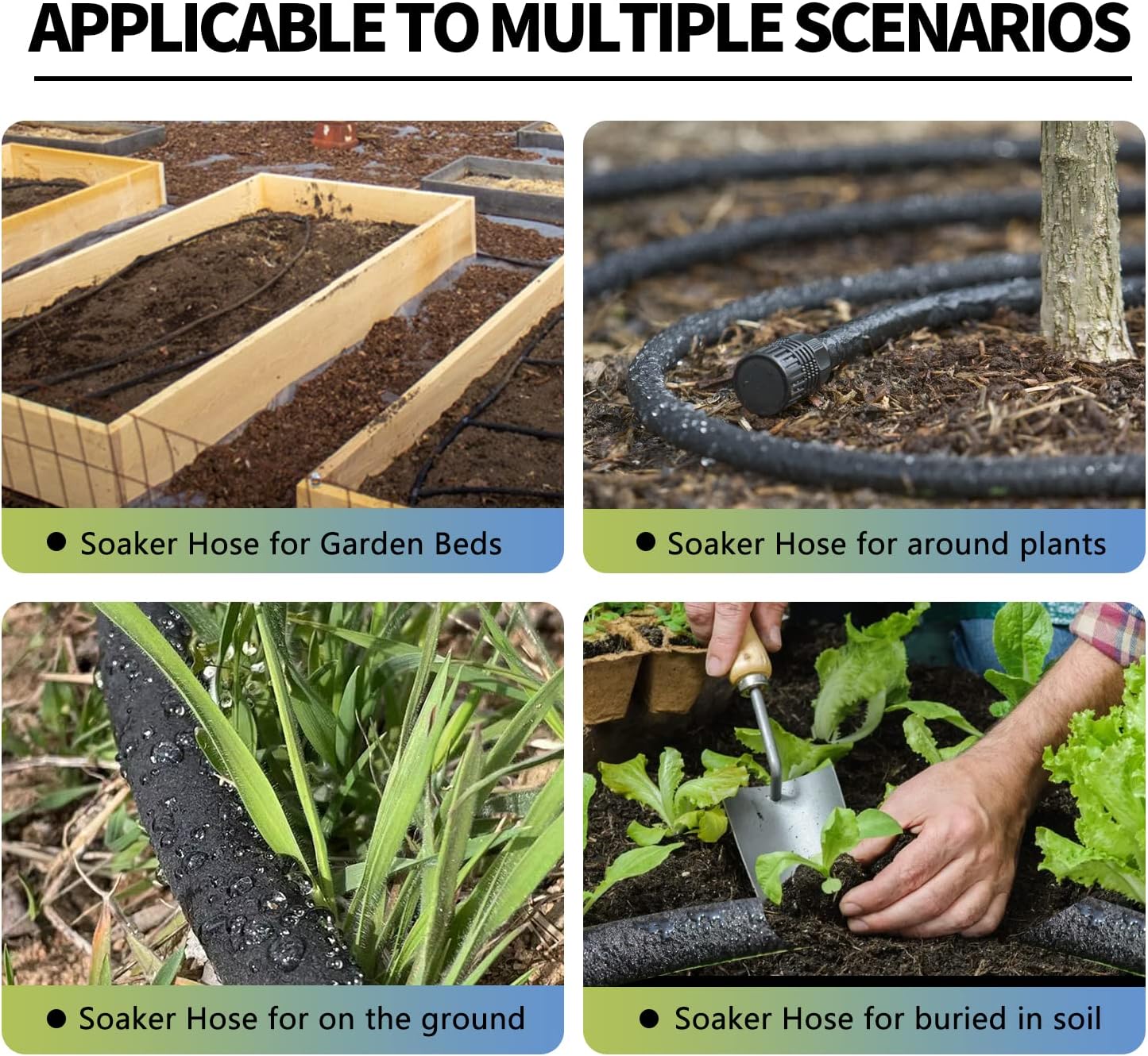 - More Widely Application - The soaker hose could be used for your vegetable beds by cutting into several short hose and connect them again with different hose couplings. Every rows of the garden beds could get enough moisture by the drip hose irrigation system. With the “T” couplings, the hose could be made a circle shape for a tree or shrubs. Therefore, the soaker hose are suitable for widely usage according to your rich imagination.