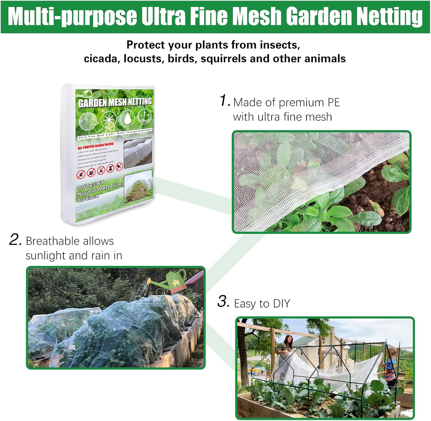 - Ultra-Fine Mesh Netting: Large size 10x33 feet provides more security. Ultra fine garden netting has a 0.8mm x1mm ultra-fine mesh, effectively protects vegetables, fruits and flowers.