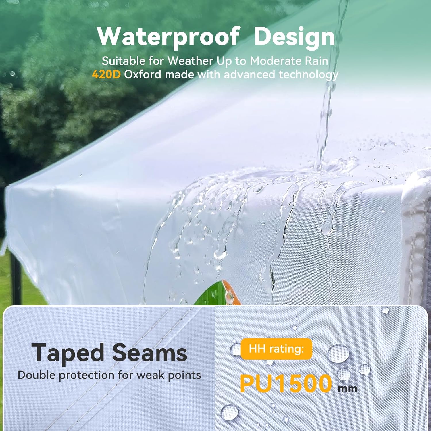 - ăPremium Canopy and Sidewallsă10x20 Party tent is made of 500D high quality Oxford with two layers of PU coating, UPF 50+, blocks 99% of the sun's rays. Seams are fully sealed to prevent water leakage, 100% waterproof. Waterproof pressure is 2.1psi, while the waterproof pressure of general tents is only 1.1psi. 6 PU coated removable sidewalls are connected by a whole strip of hook and loop fastener and zipper for tying frame top and legs.