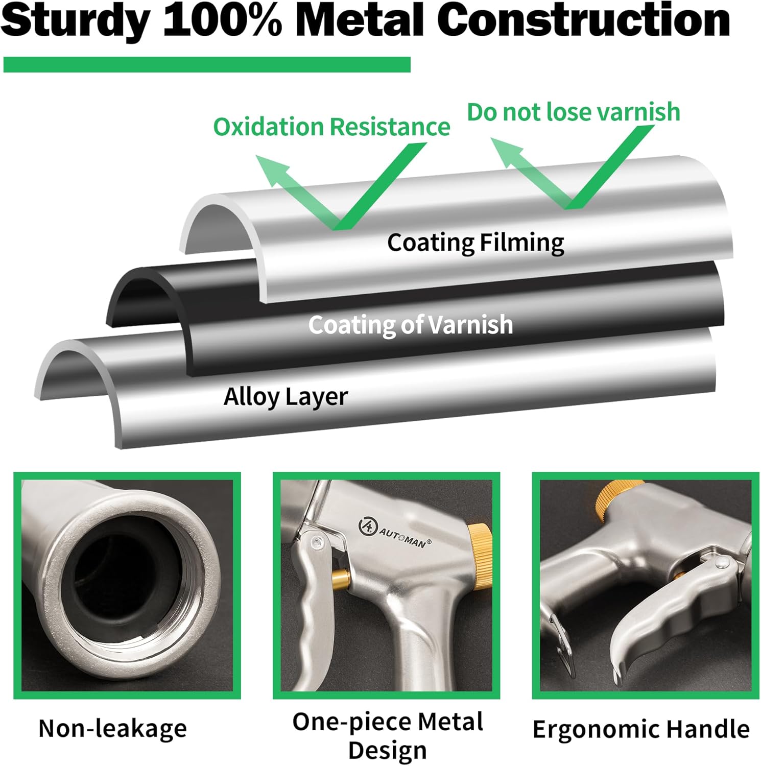 - 【100% Metal Construction】The AUTOMAN garden hose nozzle is built using heavy duty metal. It better stands up to impacts and resists corrosion. Our metal nozzles are also coated a coating film that makes the model exposed to rain and UV for several months without noticing any breaking, failing, or even rusting. Our garden nozzle is 100% metal and high quality to prevent leaks, rusts, and corrosions, much stronger and more sturdy than the plastic water nozzles.