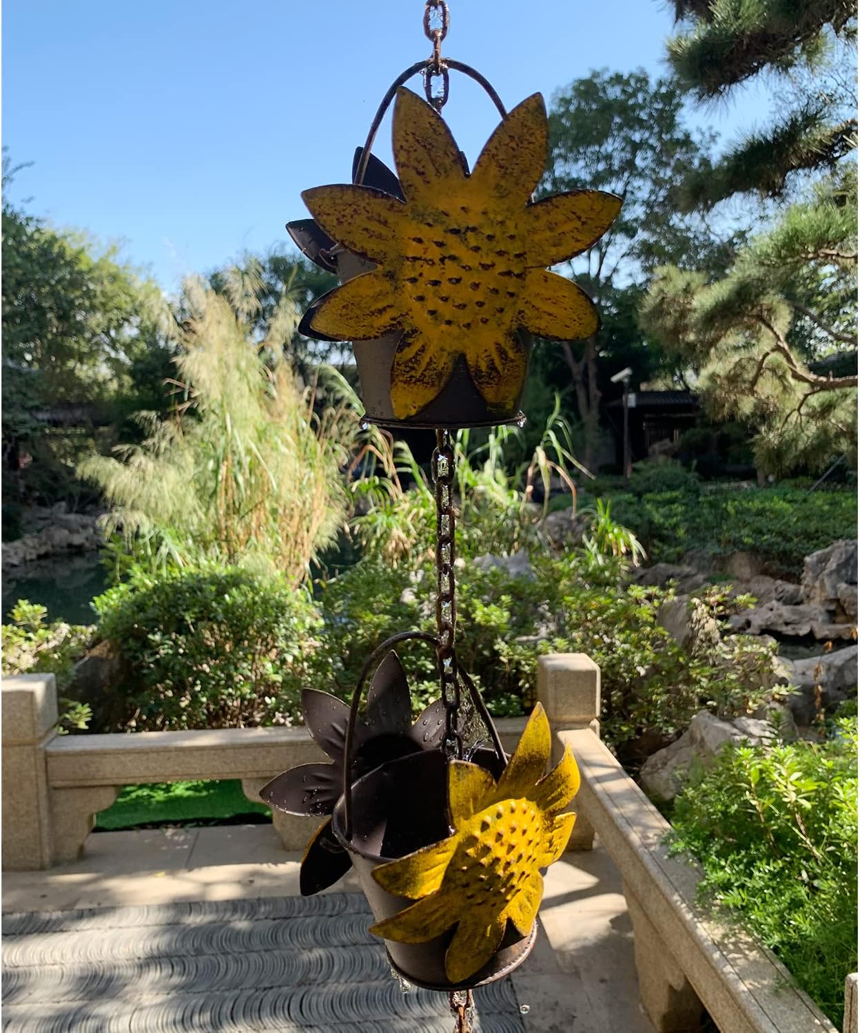 - 【High Quality Gutter Chain】 Our sunflower rain chains for downspouts are made of high quality metal materials with excellent craftsmanship, finished with vintage patina powder coating that is durable and can be used for a long time without rusting. The rain chime can withstand strong storms and downpours without damaging or shedding easily.