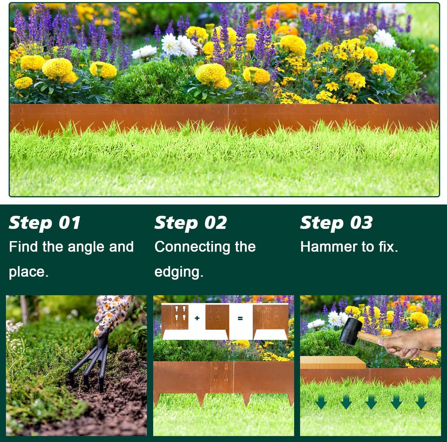 - [ Steel Landscape Edging] - This corten steel Edging is easy to use. It can be bent into any shape at will. Corten steel landscape edging's steel buckle design is easy to install, does not require any tools or professional skills, suitable for DIY and everyone, tightly connected, and will not loosen