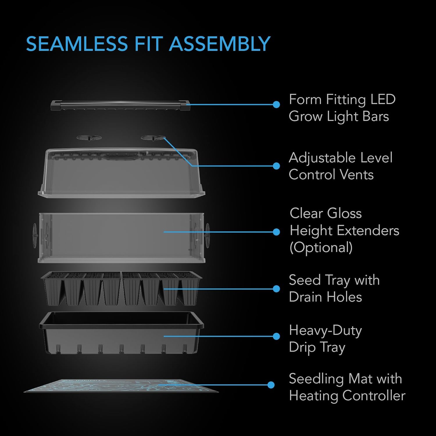 - Durable drip and plant trays with optional height extension panels support up to 40 seedlings and clones.