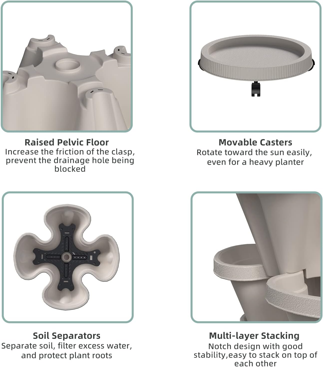 Strawberry Vertical Planter GardenTower, 5 Tiered Stackable Planter with Support Pole, Stacking Herb Vegetable Planters Indoor and Outdoor - Light Grey