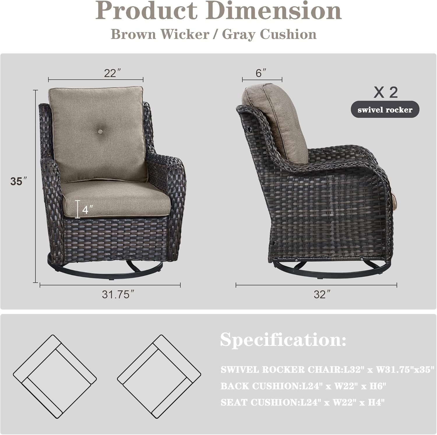 - Resistant Wicker: The patio swivel rocker chair is made of tightly woven resin wicker material, giving the wicker chair superior toughness and fade resistance. Ideal for all-weather use, it's also perfect for use on patios, porches, decks, backyards and more as a great swivel rocking chair for chatting and napping. Each wicker is hand-woven and the threads are hidden and reinforced.