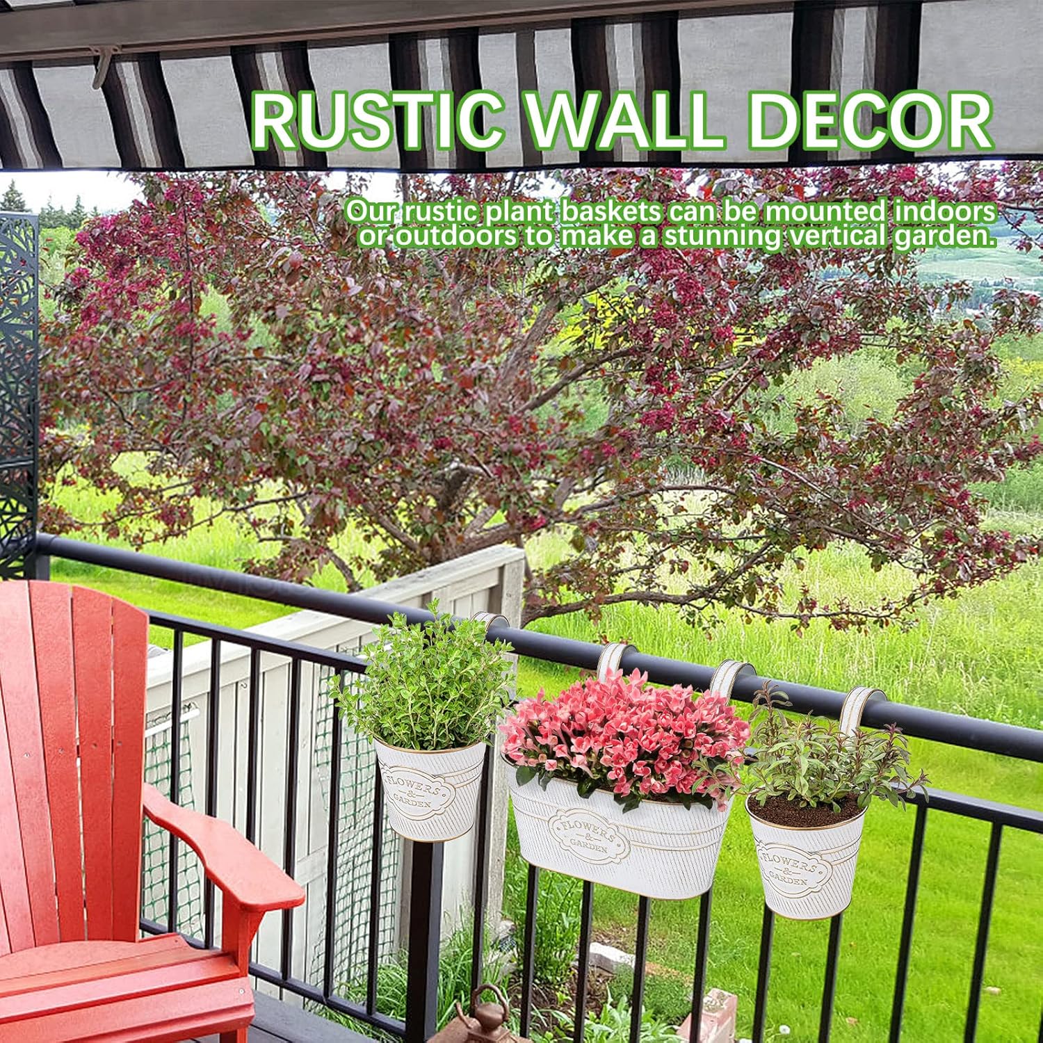 PerGar Vintage Metal Iron Wall Hanging Flower Pots, Rustic Planter Bucket Herb Flower Plant Holder with Detachable Hooks & Drainage Hole for Railing Fence Balcony Deck Garden Home Decoration, Set of 3