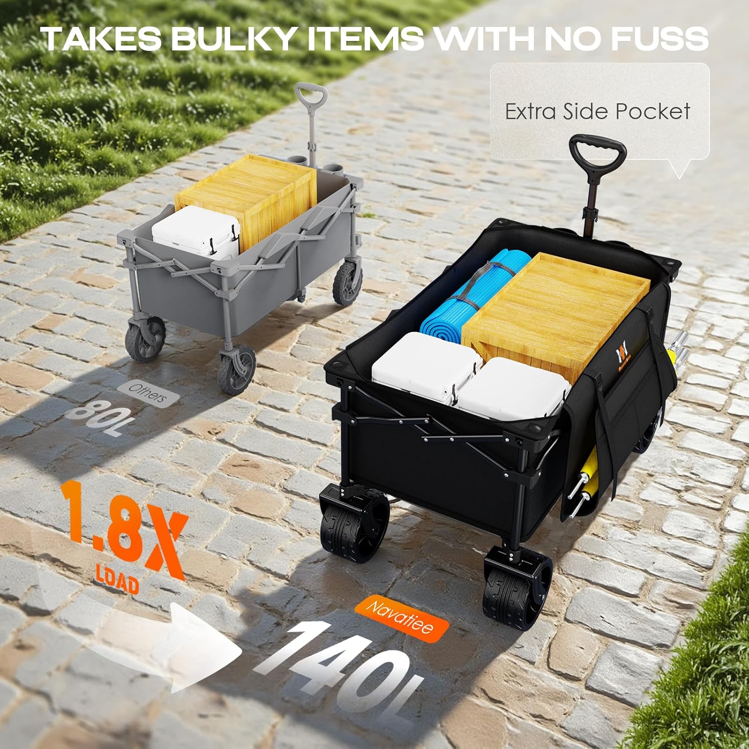 Navatiee Big Wheels Collapsible Wagon Cart Foldable, Heavy Duty Beach Wagon with Silent All-Terrain Wheels, Folding Utility Grocery Cart with Side Pocket and Brakes for Camping Garden Sports, Black
