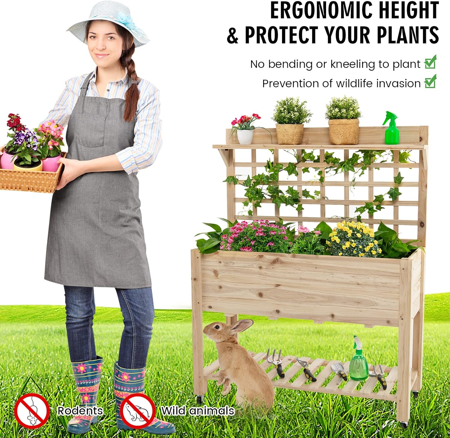S AFSTAR Raised Garden Bed with Trellis, 41.5x16x54in Mobile Elevated Planter Box with Wheels, Bed Liner, Top/Bottom Storage Shelves, Freestanding Wood Planter Stand for Garden Patio Balcony