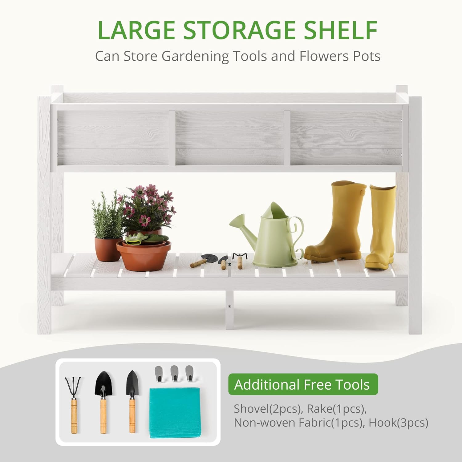 - Large Capacity: The planter box measures 46.5 inches in length, 17.7 inches in width, and 28.7 inches in height, with a 6.5-inch depth; can accommodate approximately 3.1 cubic feet of soil, including a high-density storage rack for gardening tools