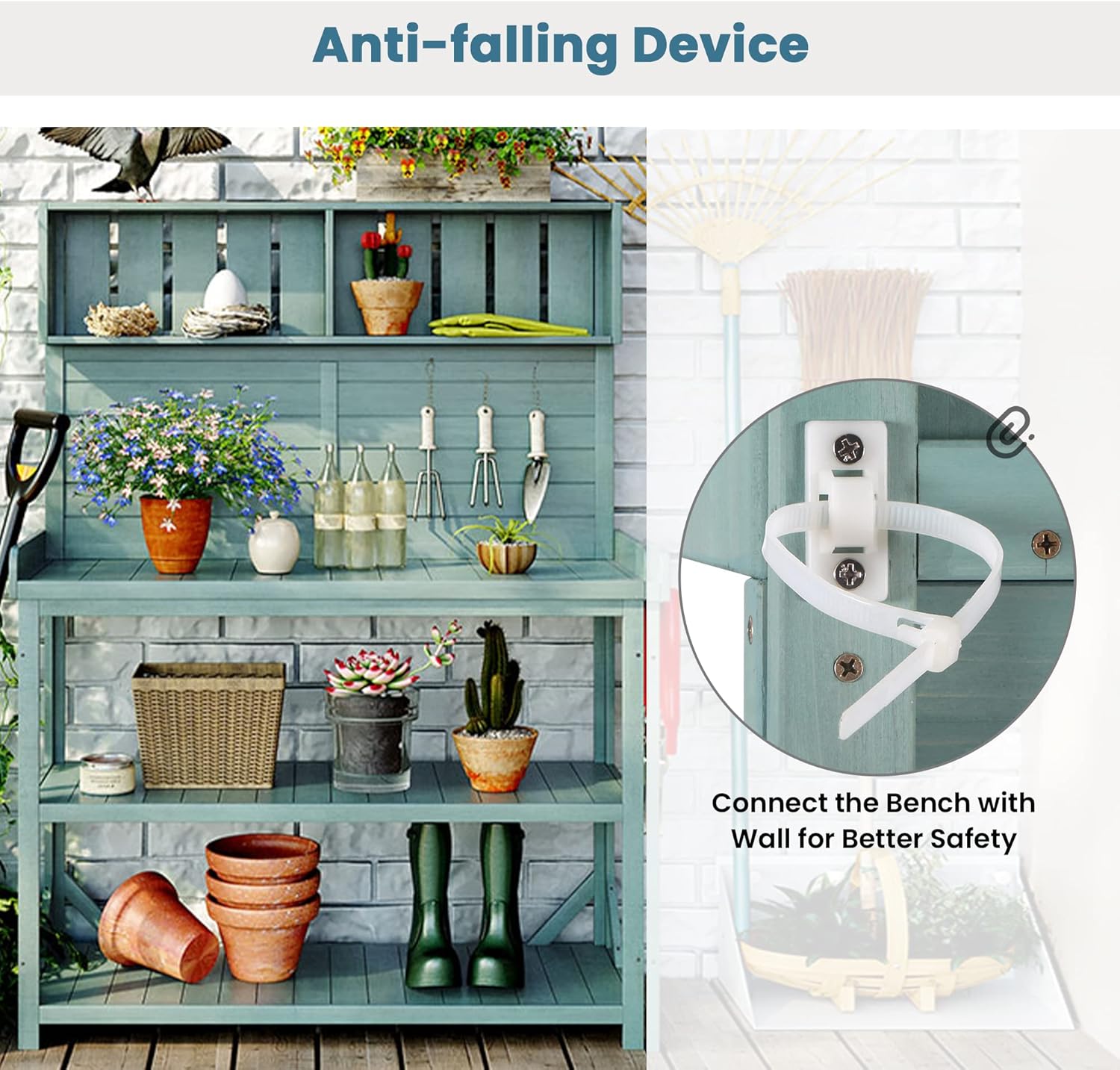 - Anti-Falling Safety Device: There is not always a flat in the garden. For your safety in setting the potting bench, it is designed with an anti-falling device. Just connect the device to a wall for better safety. To strengthen stability, 4 supportive bars are offered to fix in the lower shelves. They can be fixed in any corner until the table is stable.