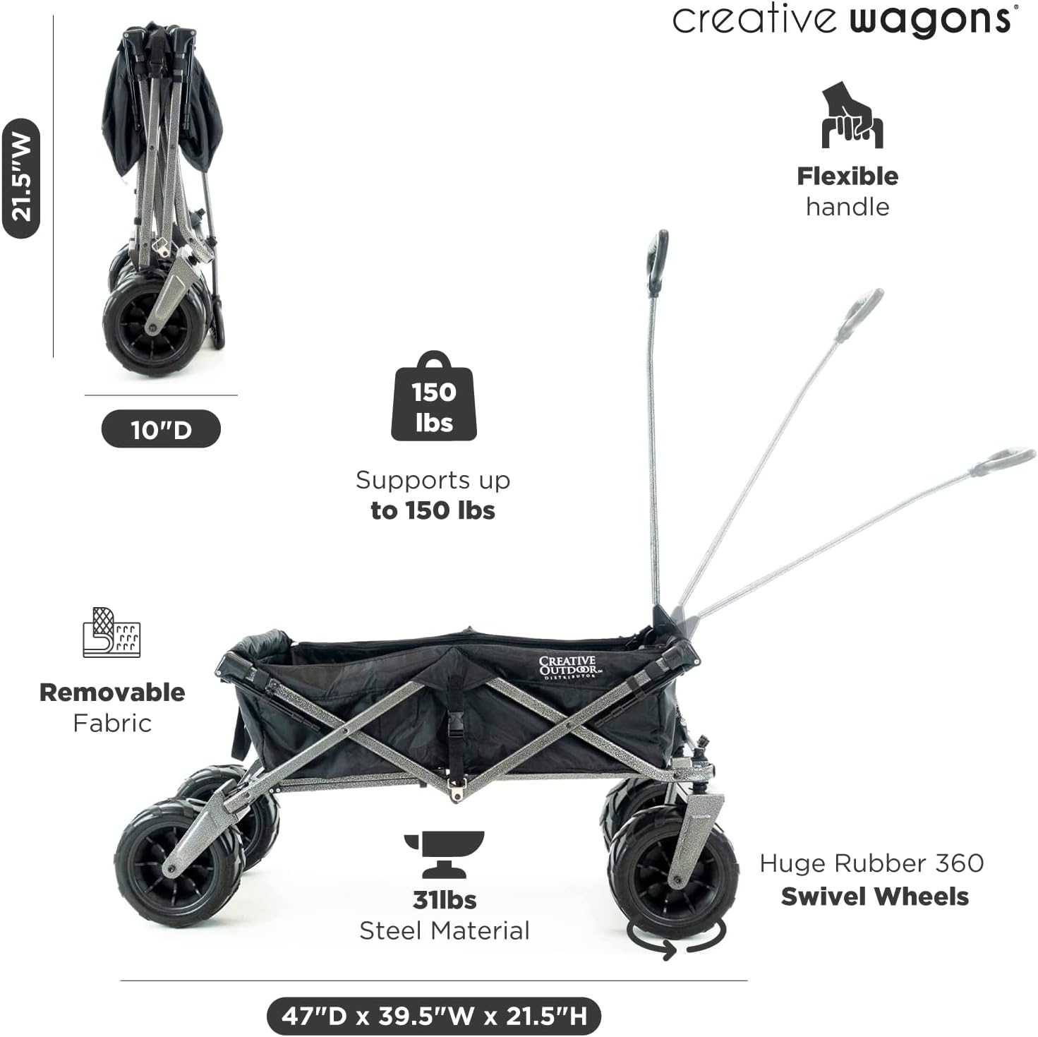 - HUGE RUBBER ALL-TERRAIN WHEELS - Comes equipped with ball bearings for decreased rolling resistance and increased load capacity. You can smoothly glide across many surfaces including grass, dirt, concrete, pavement, sandy beaches, and more! The front wheels swivel 360 degrees to allow a tight turning radius and easily maneuver around obstacles and navigate the terrain. The bigger wheels dampen the bumps in your path so the precious cargo and passengers experience a smooth ride.