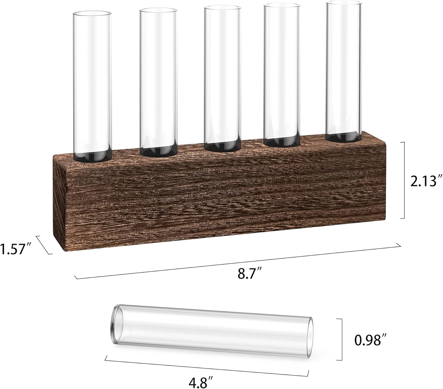 - โฅTest Tube Plant Terrarium Size: Propagation station wooden base (8.58" L x 1.37" W x 1.96" H) and five(5) glass test tubes (1" D x 4.7" H). Ideal for various plant cuttings, water plants, baby cuttings, clippings, fern, flowers. Test tube propagation stations is a perfect gift for gardeners and plant lovers. Display propagation vase on windowsills, desktops, shelves, or bedside tables to elevate your living room, dining room, kitchen, cafe, or office decor.