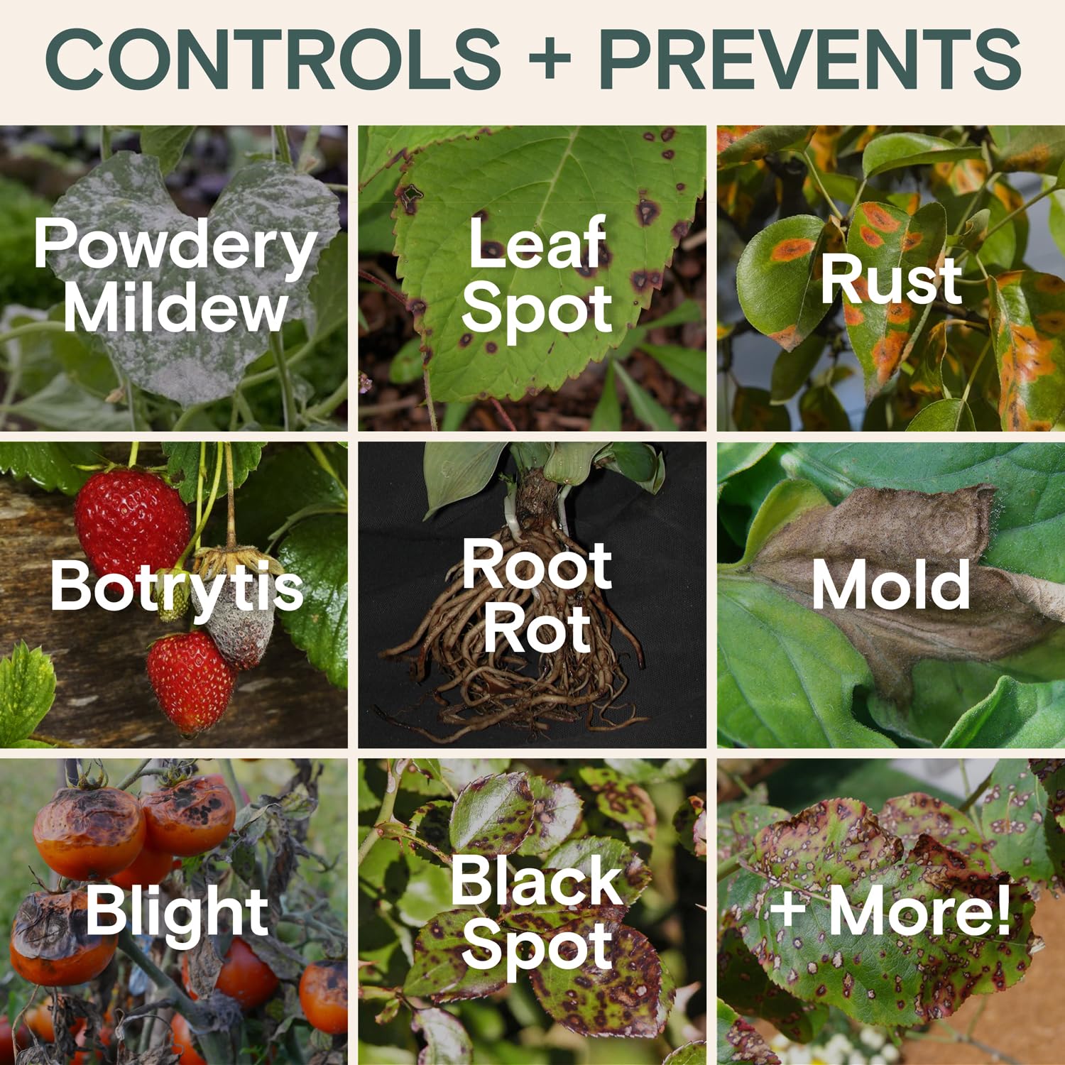 - Coverage : ROOT ROT, BOTRYTIS, LEAF SPOT, RUST, POWDERY MILDEW, DOWNY MILDEW, BLACK SPOT ON ROSE, WHITE + GREY MOLD, +MORE ROOT ROT, BOTRYTIS, LEAF SPOT, RUST, POWDERY MILDEW, DOWNY MILDEW, BLACK SPOT ON ROSE, WHITE + GREY MOLD, +MORE