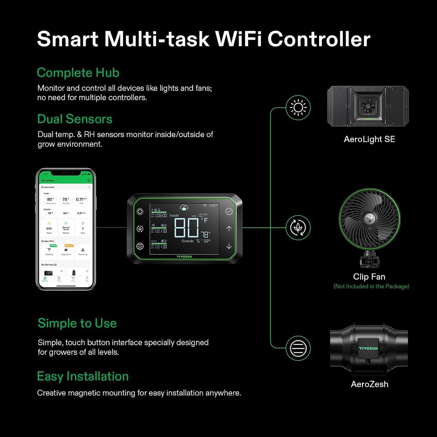 - Environmental Monitoring: With a built-in temp and humidity gauge and one probe, the GrowHub Controller E42A monitors changes in both the internal and external environment, and you can view this data and program through the App