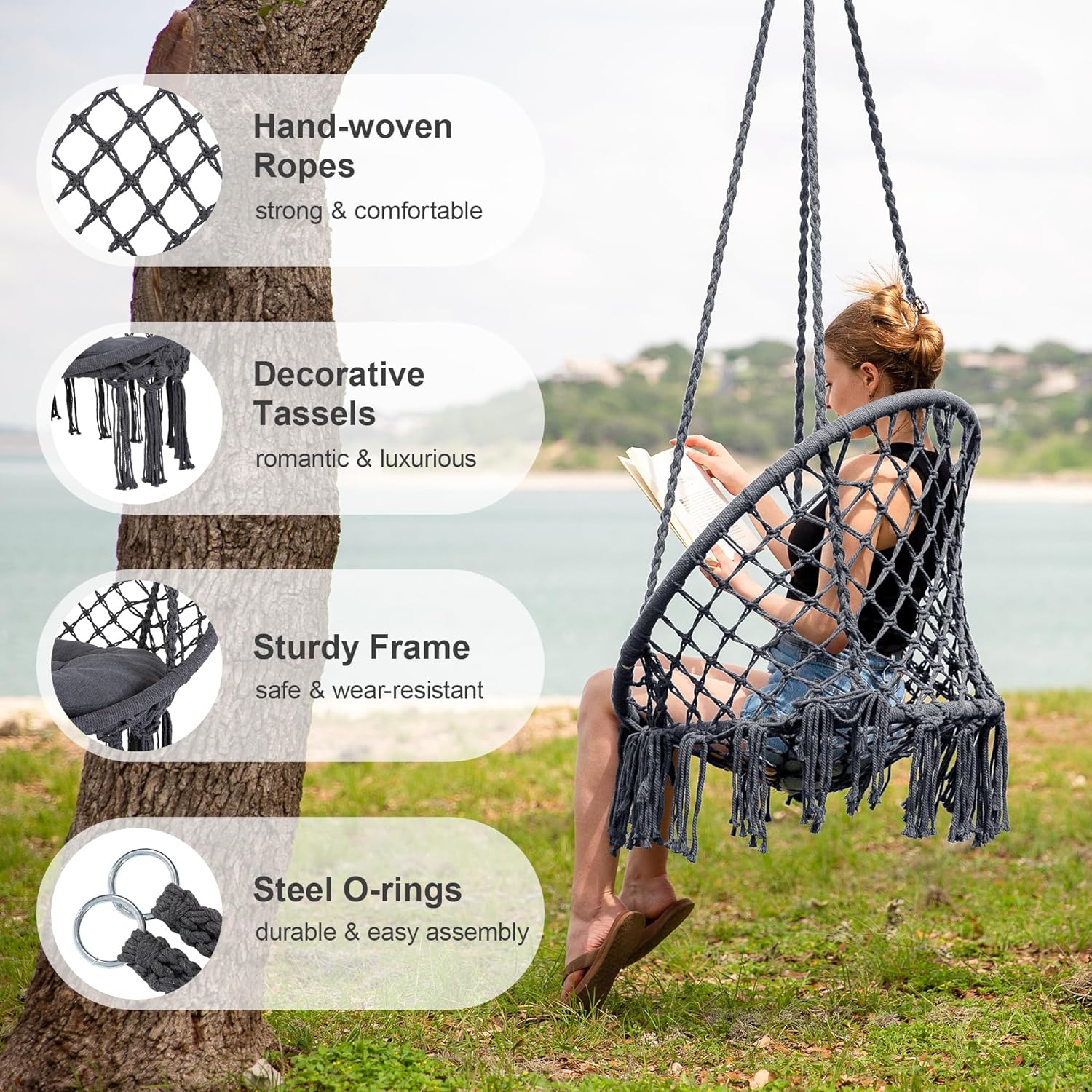 SUNCREAT Hammock Chair Hanging Macrame Swing with Hardware Kits, Max 330 Lbs, Handmade Knitted Mesh Rope Swing Chair for Indoor, Outdoor, Bedroom, Patio, Yard, Garden, Pack of 2, Grey