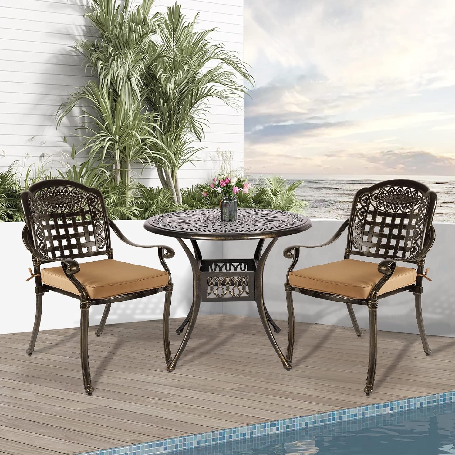 - 【Durable 3-Piece Dining Set】 - Made from cast aluminum for long-term durability. Resistant to rust, weather, fade, crack. This patio set includes 1 round table, 2 chairs, 2 cushions, and they stay in perfect condition regardless of the weather. It's also easier than ever to clean, just use a dry or damp rag to wipe down.