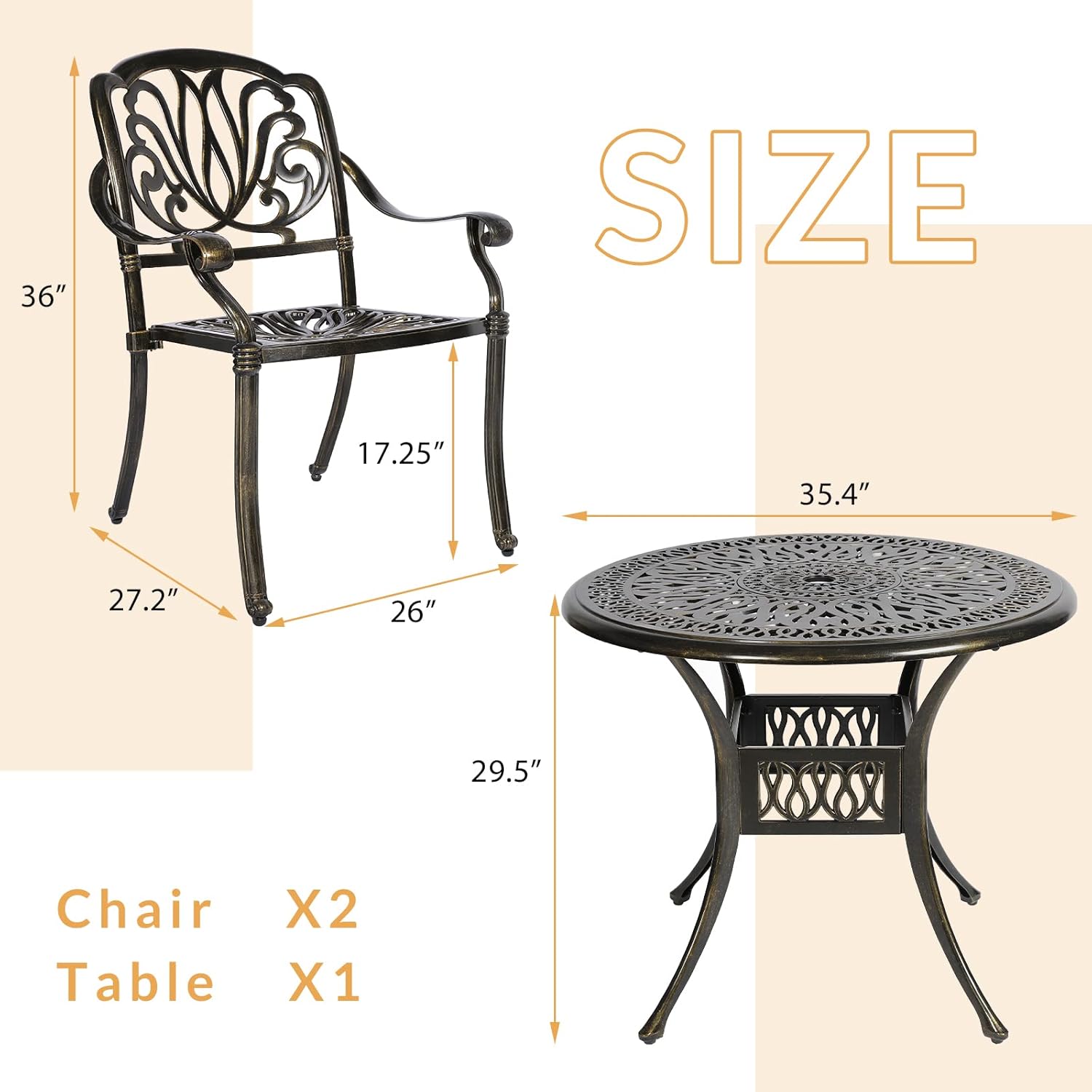 3-Piece Outdoor Patio Dining Set, All-Weather Cast Aluminum Patio Furniture Set for Backyard Garden Deck with 2 Chairs and 35.4” Round Table, 2" Umbrella Hole
