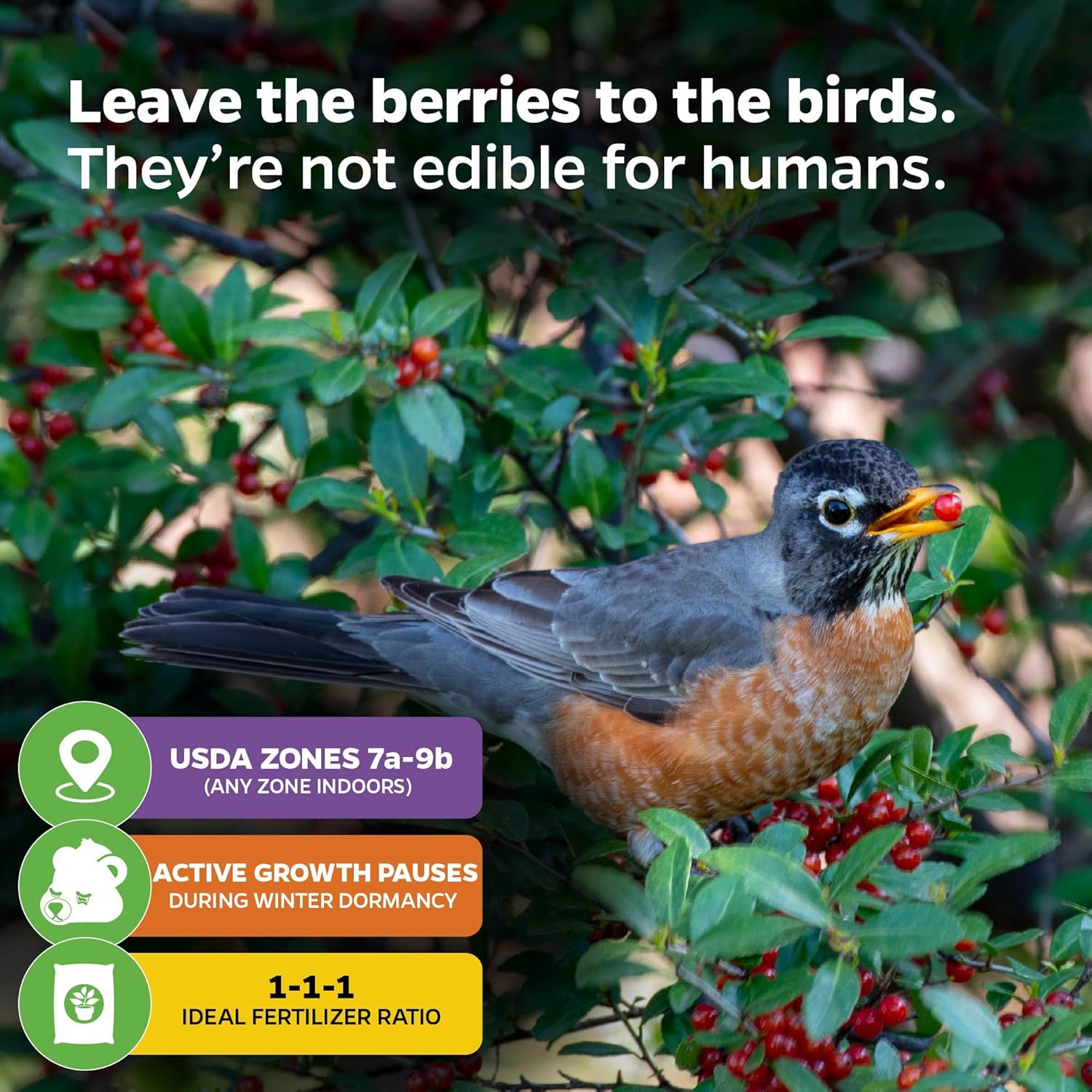• RICH HISTORICAL ROOTS: Embrace the rich heritage of the Yaupon Holly, a revered plant among indigenous Texans. Thriving as a holly bush from coastal Texas to Virginia, it's a living piece of history. This ilex plant is more than just a shrub; it's a testament to age-old traditions.