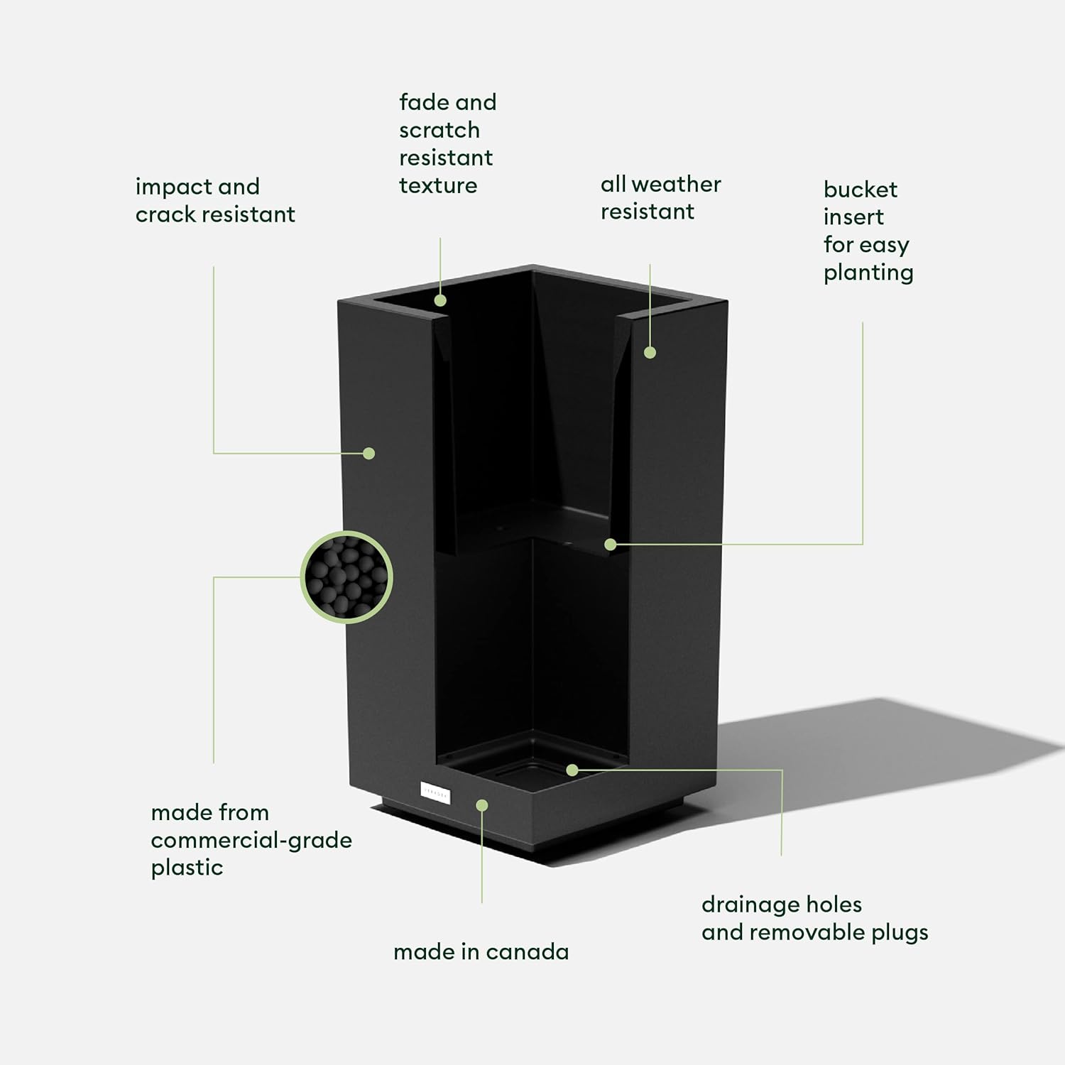 - DIMENSIONS & DETAILS: This double-walled planter’s exterior dimensions measure 26” in Height, 13.5” in Width, 13.5” in Length. With the removable insert bucket installed, the interior dimensions measure 11.75” in Height, 11” in Width, 11” in Length. It comes fully assembled for easy use