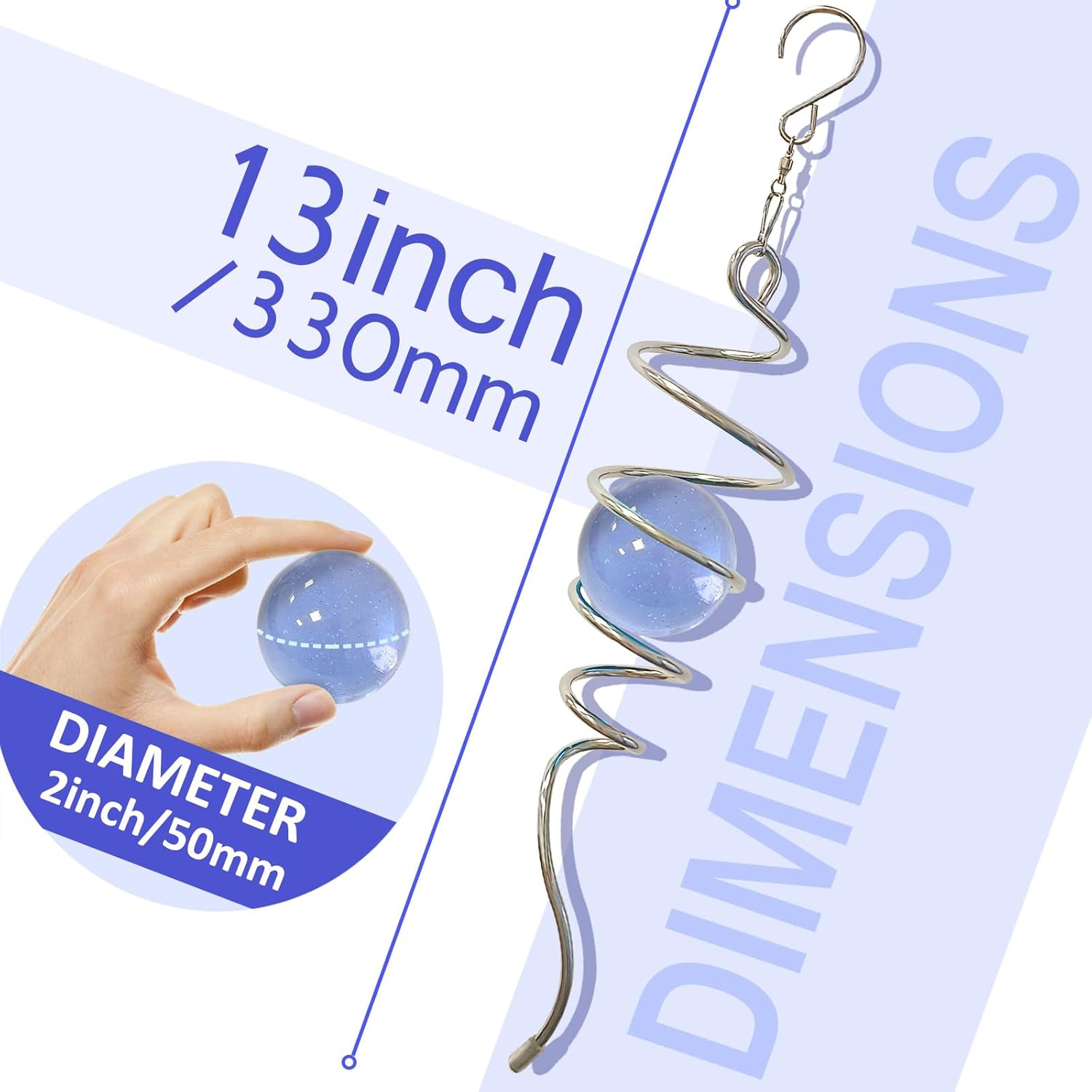 - 【EASY TO POSITION】:The Spiral can't spin by itself ,if you want to make it spin like the video ,need add 1pc motor (not include) ,or combine it with a wind spinner or any rotatable hanging ornament to help it rotate. Come with 1pc 2 inch colored glass orb(not paint), 1pc silver color spiral tail twister,and 1pc swivel hook accessory, ready to hang and enjoy.