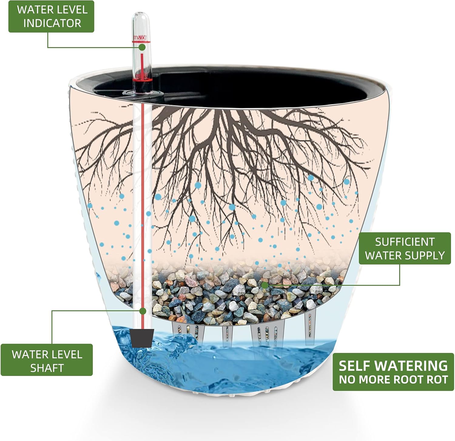 - SELF WATERING & NO MORE ROOT ROT - The smart unique sub-irrigation system is one of the most appealing aspects among all Dexceder planters. The easy-to-use separated integrated water reservoir or catcher- keeps your soil well aerated and automatic supplies plants with the right amount of ongoing moist air & nutrition for optimal growth. The insert indicator shows you the exact time to water again. The full water supply period can single-handedly last over 3 weeks based on different live plants