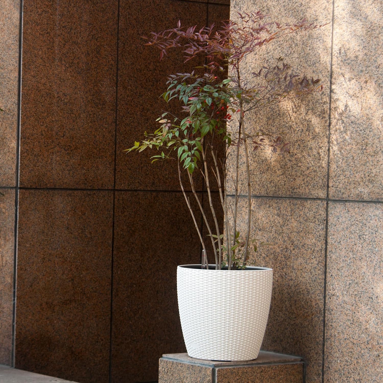 - Rattan Design: The wicker-style planter provides a pastoral, natural look for indoor or outdoor use.
