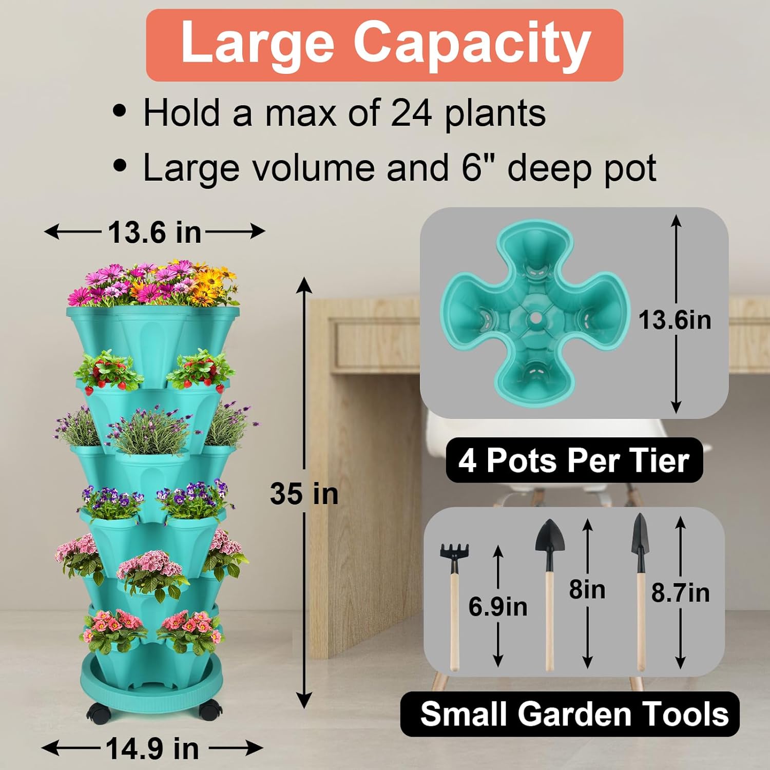 DUNCHATY Stackable Planter, Vertical Garden Planter with Wheels and Tools, Self Watering Strawberry Planter Indoor/Outdoor 6 Tier Herb Planter Pots for Growing Vegetables and Succulents, Teal