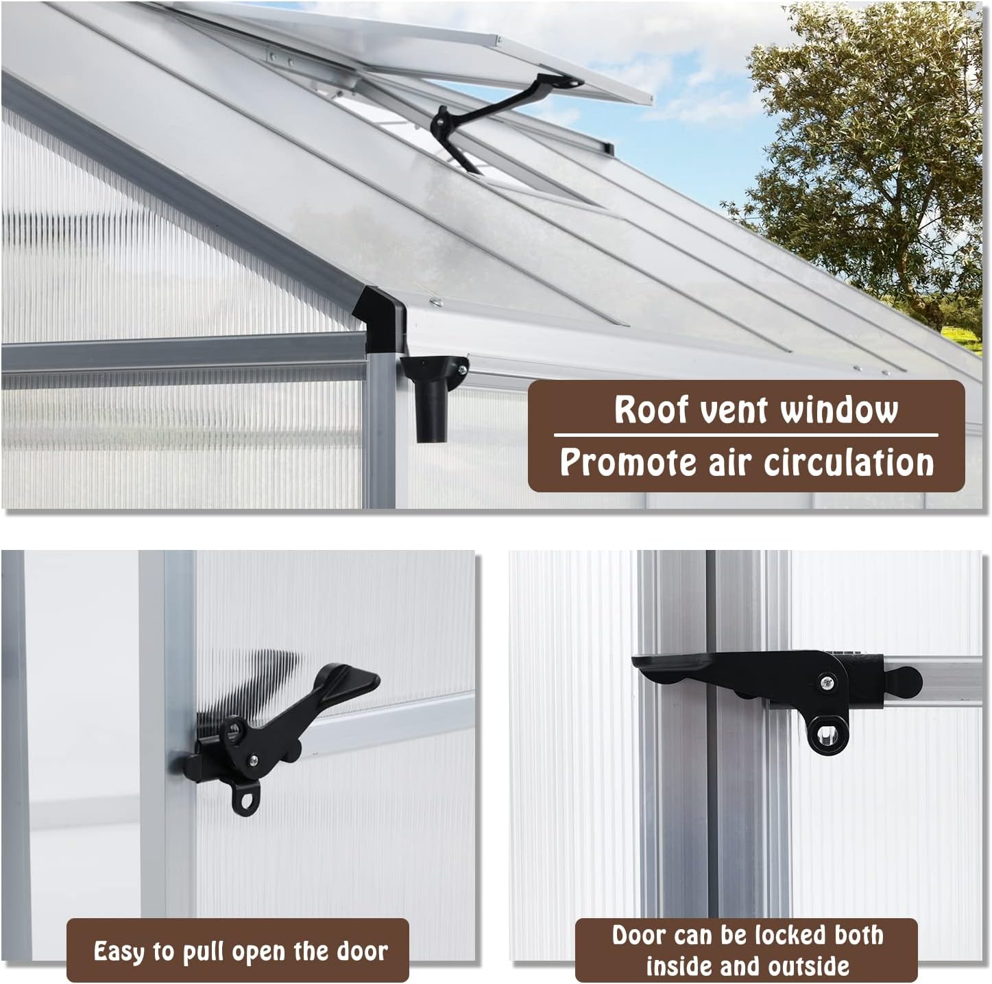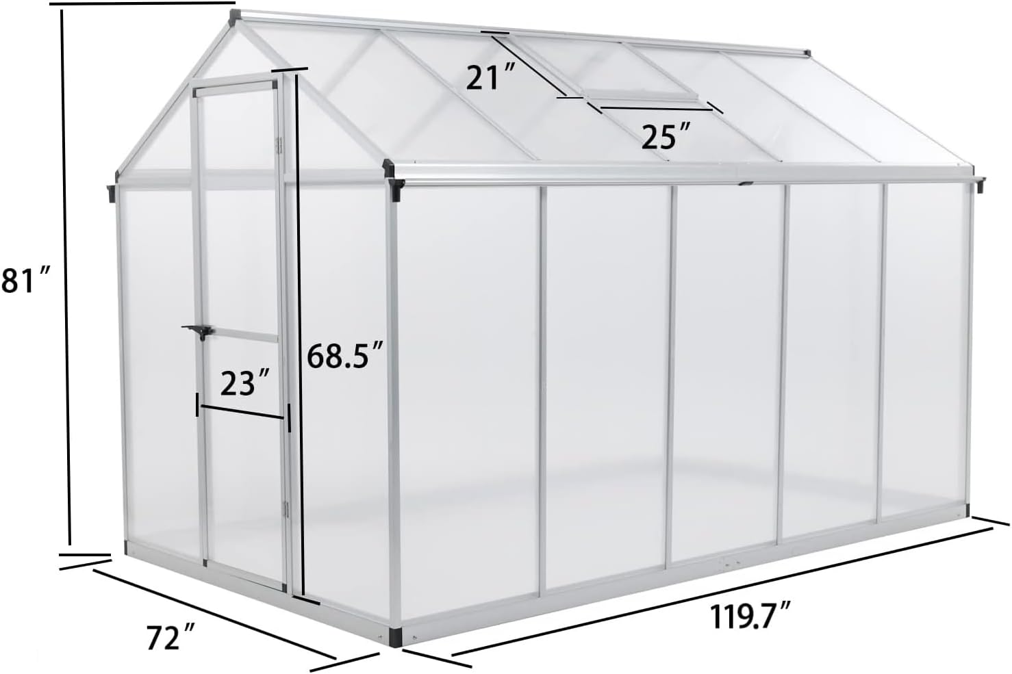 BPS 6x10 FT Walk-in Polycarbonate Greenhouse with Heavy-Duty Aluminum Frame, Vent Windows, and Lockable Door for Outdoor, Patio, Backyard, and Garden