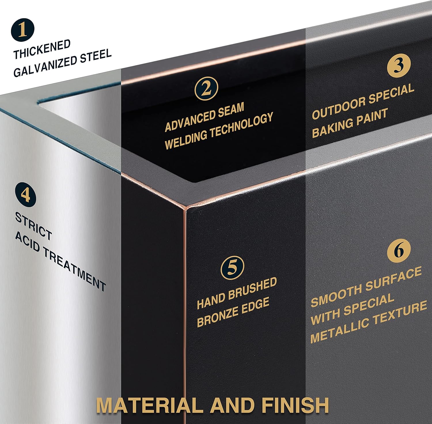 - METALLIC HEAVY PLANT BOX: This planter box is made from a fully seam welded thick galvanized steel, and adopts outdoor special baking paint, giving the surface a premium metallic color and special texture through the advanced powder injection process.