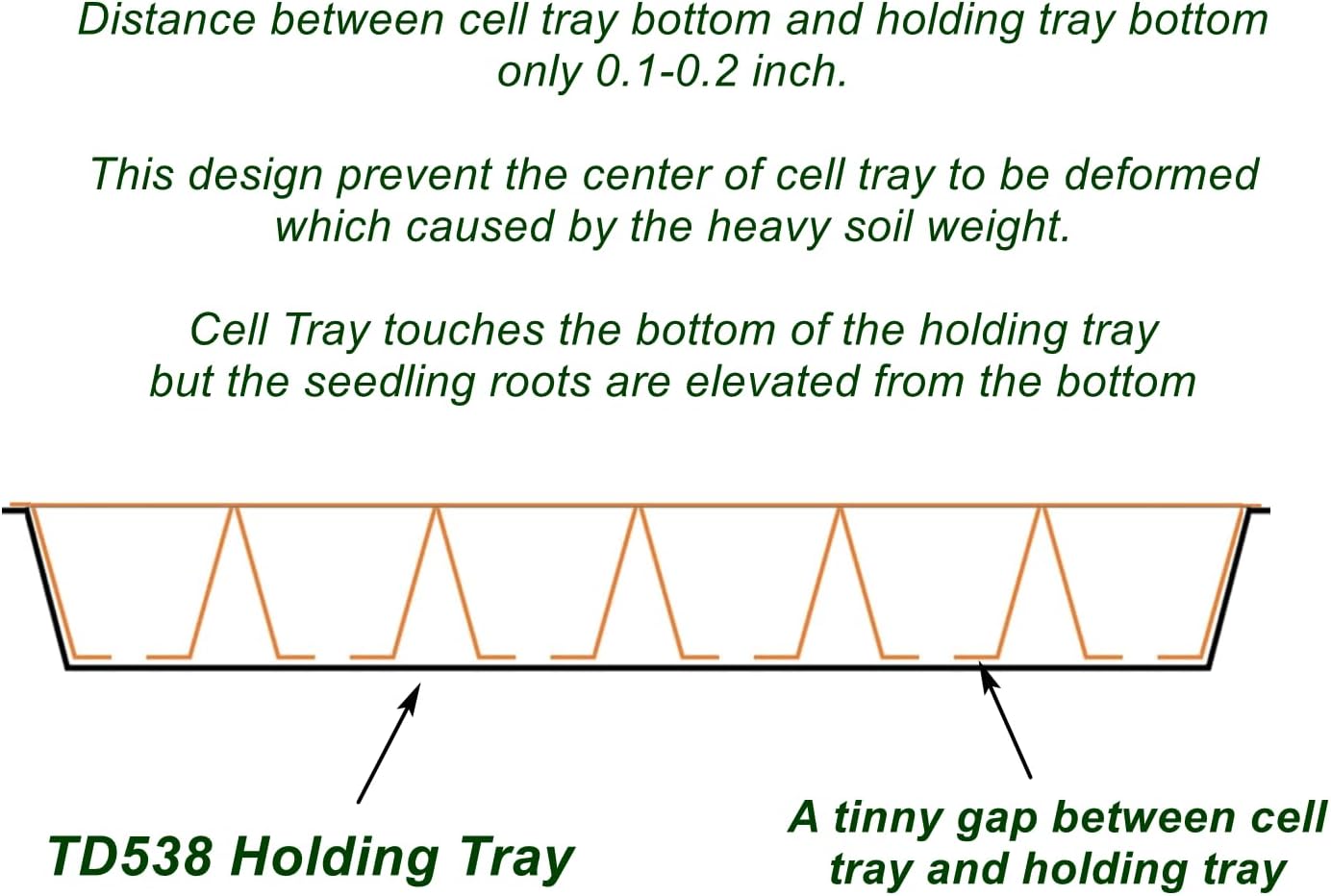 - 【Size】The top of the TD538 plant growing tray, 21 inches × 11 inches, fits perfectly with our plug trays, while the bottom, 19.1 inches × 9 inches, is also designed to fit our plug trays, ensuring that the trays won't move or shake when you move them. The tray height of 1.6 inches is designed to match the depth of the RooTrimmer 72 cell and 128 cell trays. Note: TD538 trays pfit the plug trays around 1.8 inch in height .