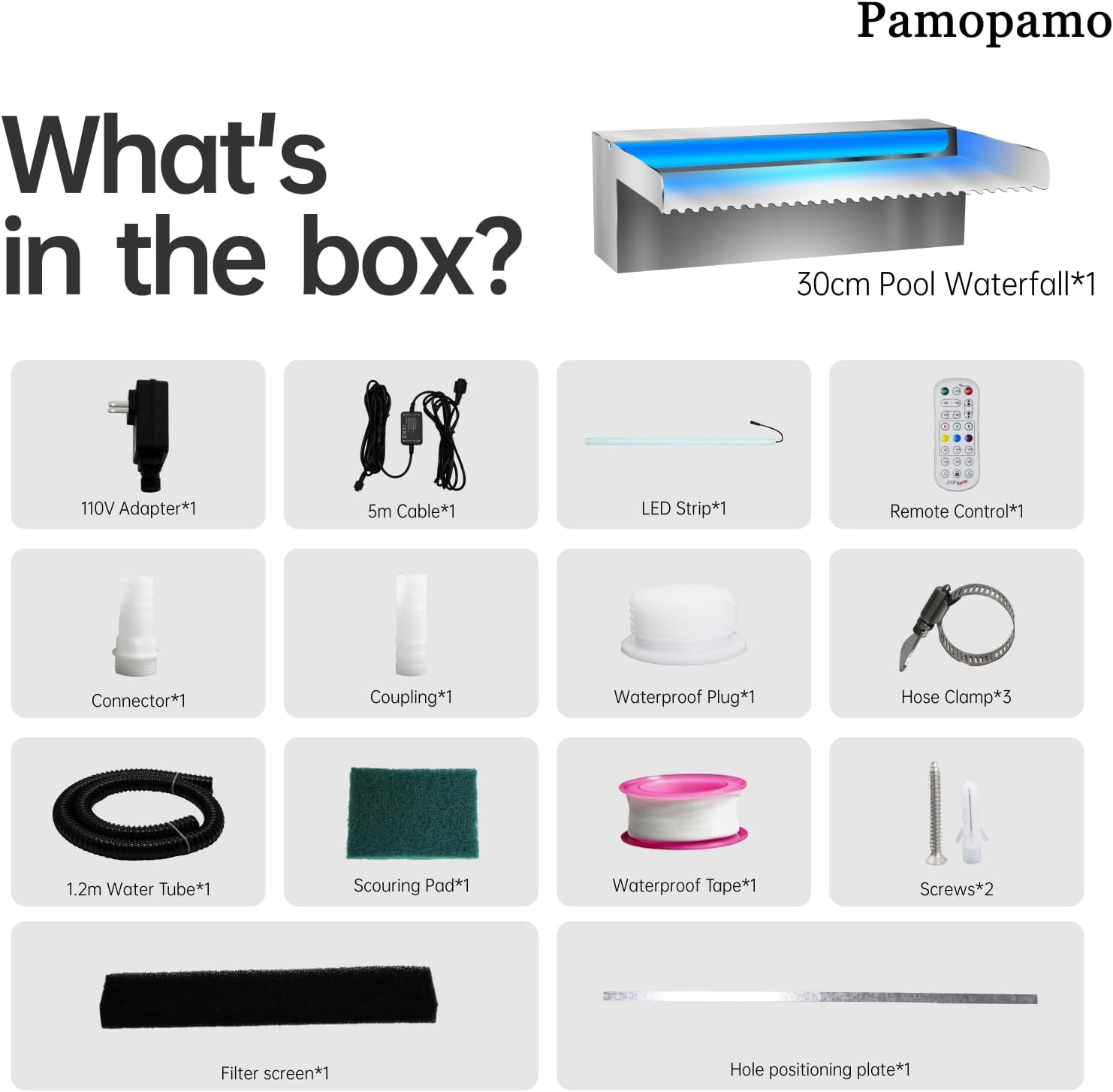 - ⏩Decoration Pool Waterfall⏪ Pamopamo waterfall spillway makes your garden swimming pool and koi pond elegant, fashionable and beautiful. The color change of LED lights and the gentle sound of water running make your patio more special at night.