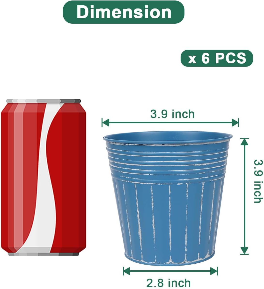 - 【Size of Metal Flower Pots】There are 6pcs metal planters in a package. The topper opening diameter 3.9 inches, the bottom diameter 2.8 inches, and the barrel height is 3.9 inches. These tin buckets have ample space for plant growth, making them ideal for succulents, herbs, and flowers, keeping your greenery vibrant.