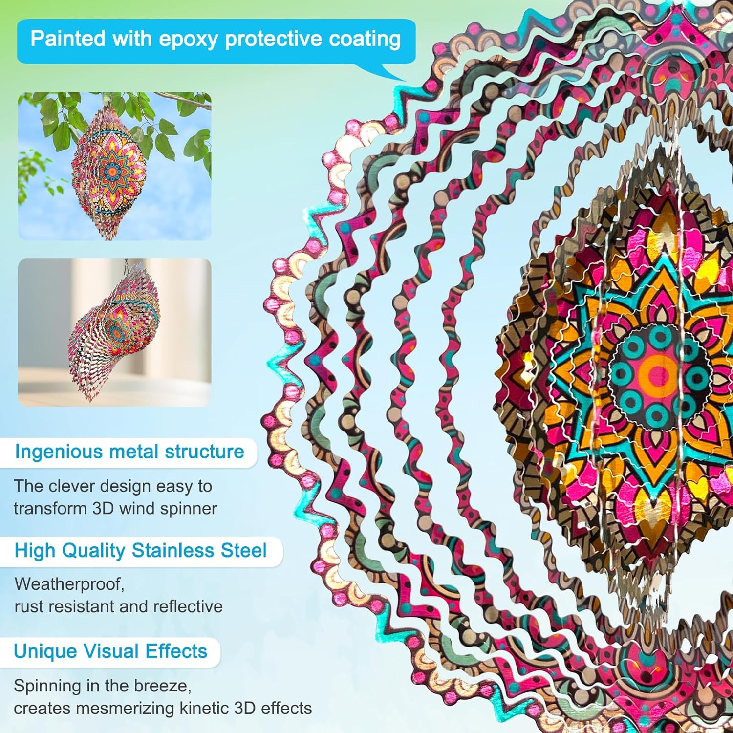 - ăKinetic 3D Wind SpinnerăThe kinetic 3D mandala wind spinner has a stunning 3D mandala design that the unique flow of light surface adds vibrant colour and movement! This kinetic art metal wind spinner will add charm to your garden or yard.