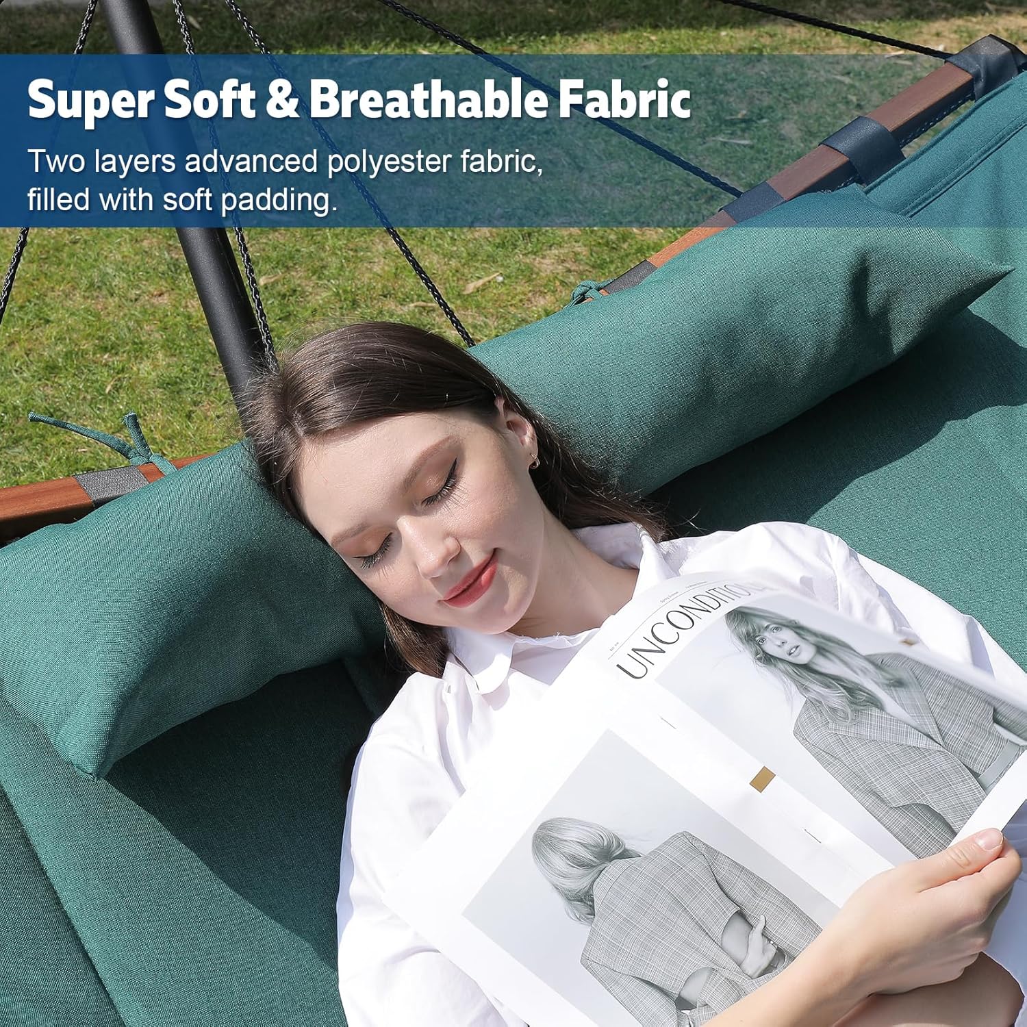 - ā Super Large Hammock: 55in width x 79in length large hammock bed can easily accommodate 2 people to enjoy the leisure time simultaneously (maximum 450lb capacity). The pillow is lengthened to 35.4in for two people. Besides, the hammock comes with a detachable side pocket for phone, books, cups and other stuffs for your convenience.