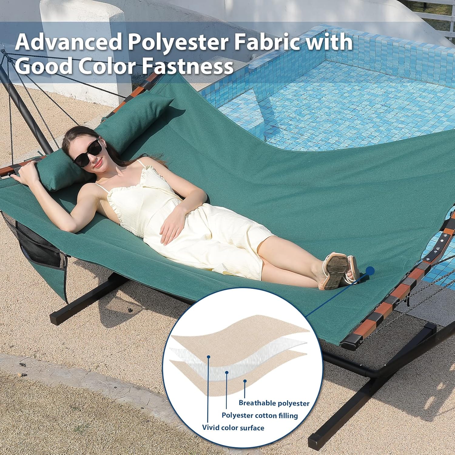 - ā Premium Weather-Resistant Polyester Fabric: Two-layer quilted fabric hammock, filled with soft padding. Resting on our hammock for a moment feel like laying on the cloud. After strict selection, we use a kind of premium polyester fabric for our hammock which has better color fastness and brings you more comfortable feeling.