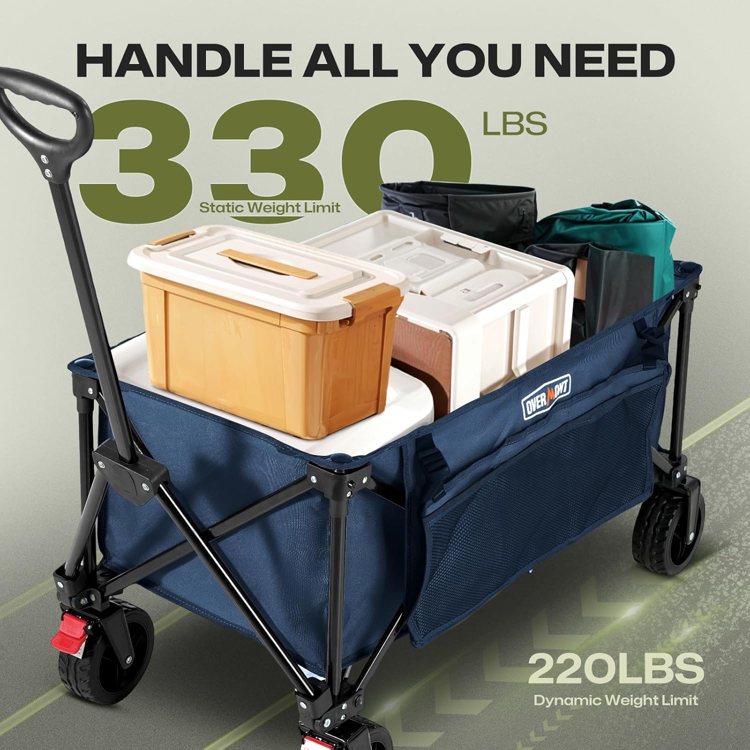- [Tackle All Terrains]: Unlike most narrow-wheeled carts, the Overmont collapsible wagon features four all-terrian wheels with dual bearings for superior stability and maneuverability. Whether on firm sand, rocks, grass, or mud, these wide wheels make transport smoother and easier. Perfect for any outdoor adventure, this cart is built to handle any terrain with ease.