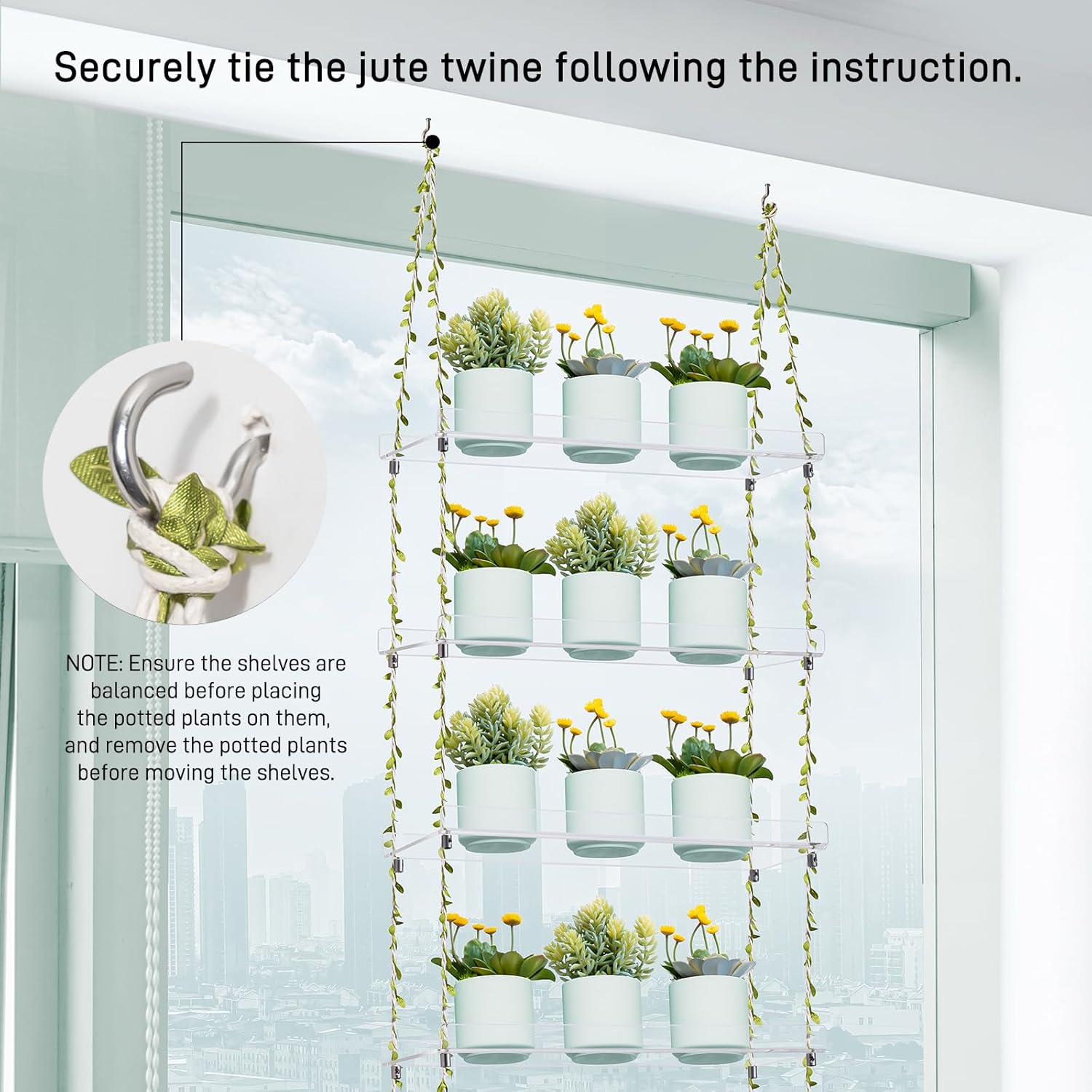 Sumerflos Acrylic Window Boxes Window Plant Shelves 4 Tier - Clear Hanging Shelf Indoor Jute Twine Adjustable Plant Holder for Window Wall Living Room Balcony Natural