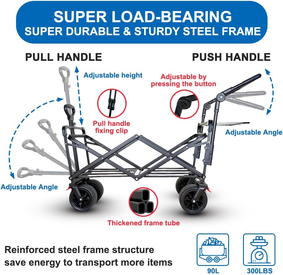 - 🛒Foldable Wagon with Big Wheels: The large wide all terrain wheels suit different road surfaces, such as mud, sand, gravel roads,etc. The front wheels can rotate 360 degrees, easy to go ahead and turn around. Also, Pull and push handles are adjustable for different heights of people. Whichever direction you want to go, you'll have no trouble wheeling this cart around.