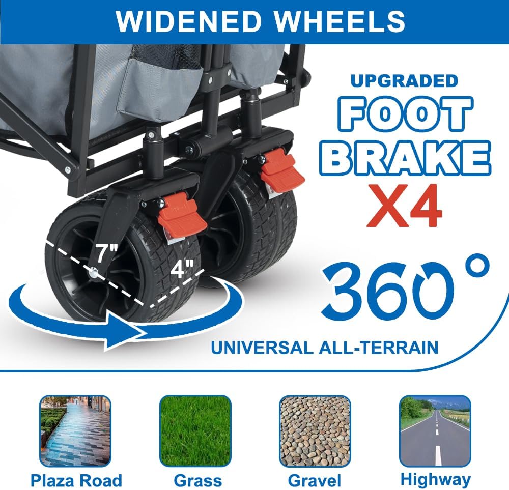 - 🛒Stable & Safe Foldable Wagons: 360° universal 4" widened and 7" diameter large all-terrain wheels, no matter on the beach, grass, gravel road or bad road conditions, it can drive stably and bring you a more comfortable experience. Equipped with 4 foot brakes, it can help us control the cart more easily and keep the stability of the cart, improving the safety of us.