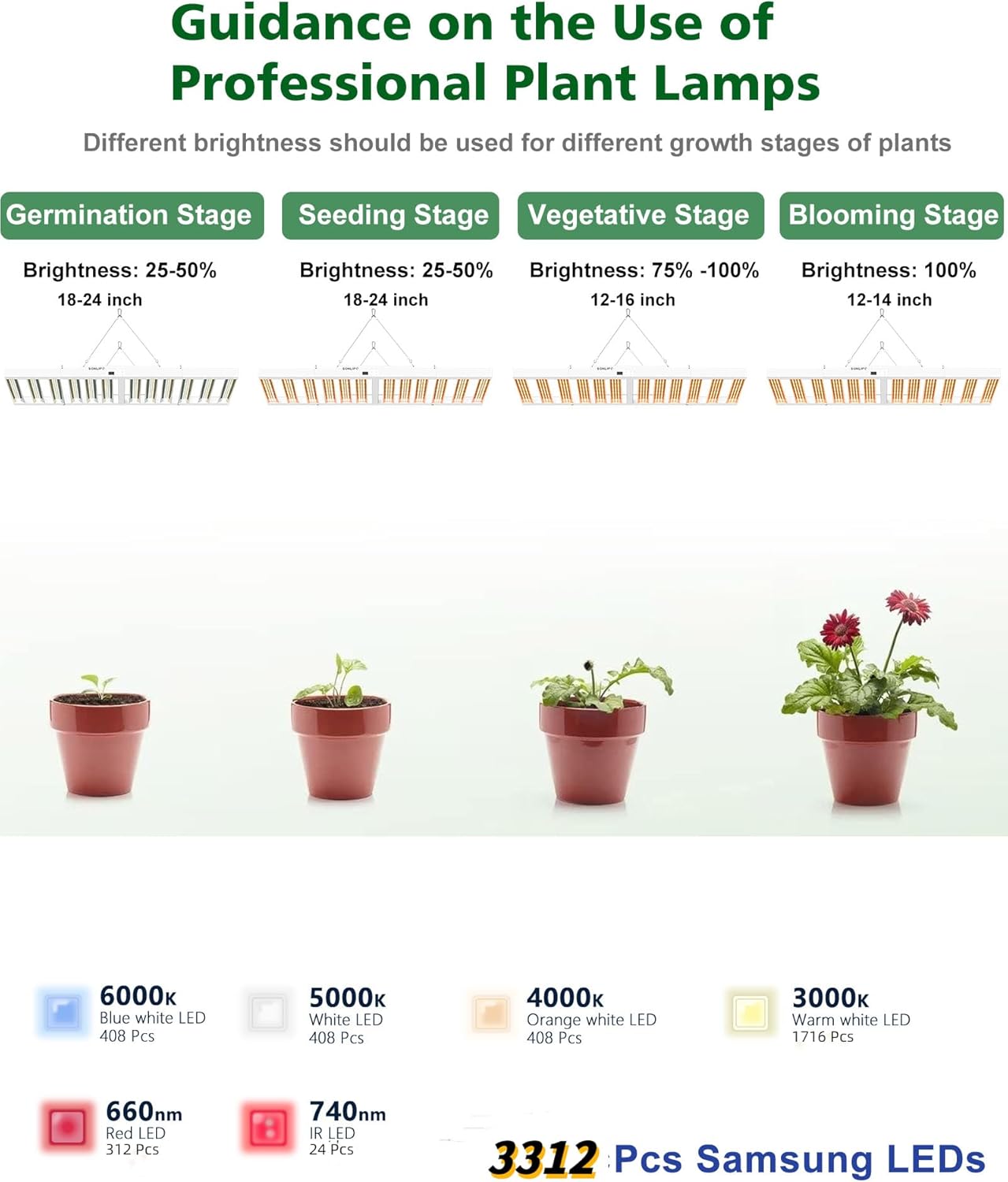 - Professional 3-Stage Full Spectrum: Sonlipo plant light is designed with 3 types of Sunlike full spectrum to meet the different growth stages of plants, including Seeding, Vegetative, and Flowering & Fruiting stages. This increases plant yield to a maximum of 2.9 g/w. The 3 full spectrum modes are controlled by a panel (VEG, V&B, BLOOM), making it easy to use and adjust.