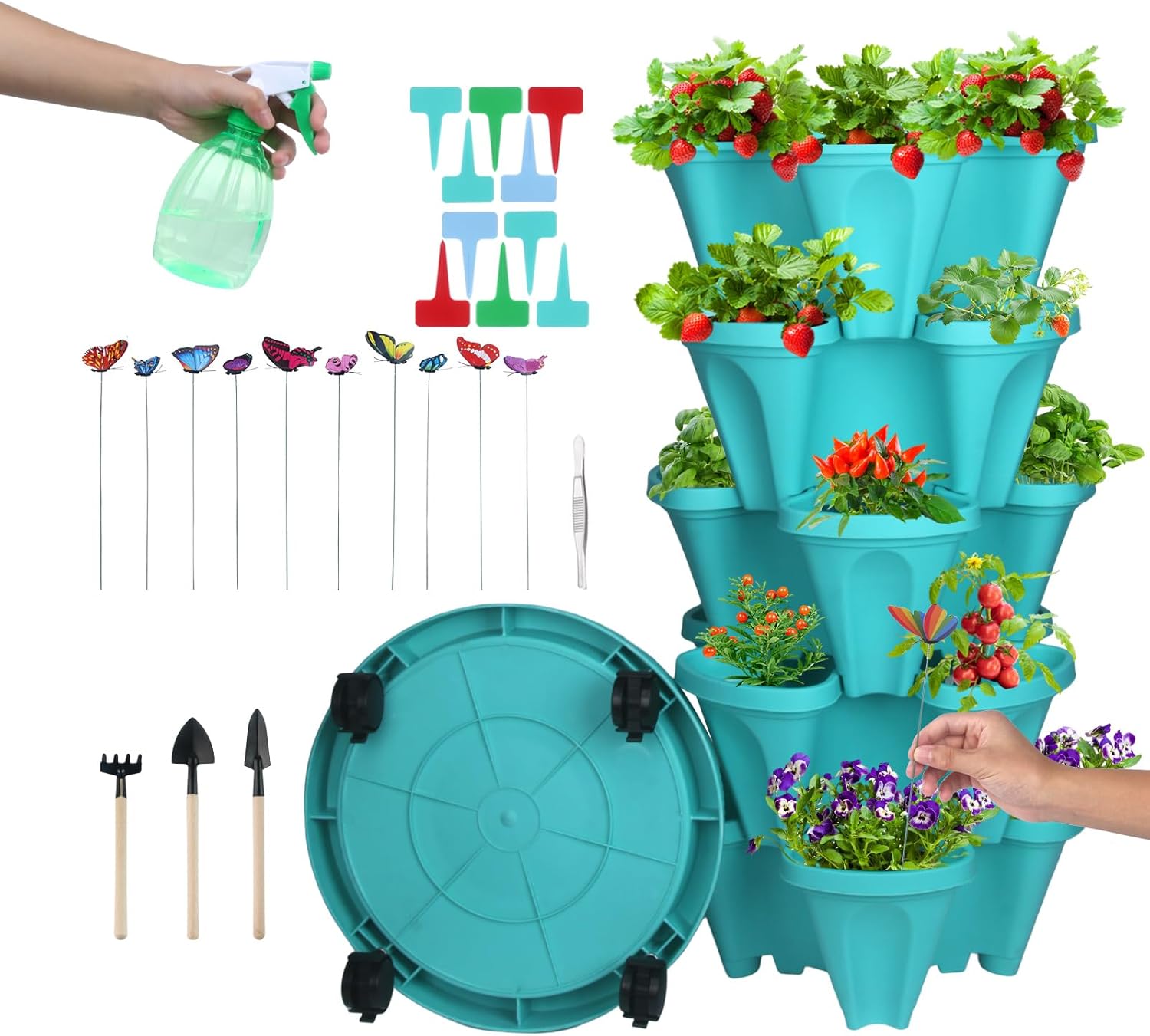 DUNCHATY Stackable Planter, Teal, 6 Tier Garden Tower, Self Watering, Indoor/Outdoor, with Garen Tool Set