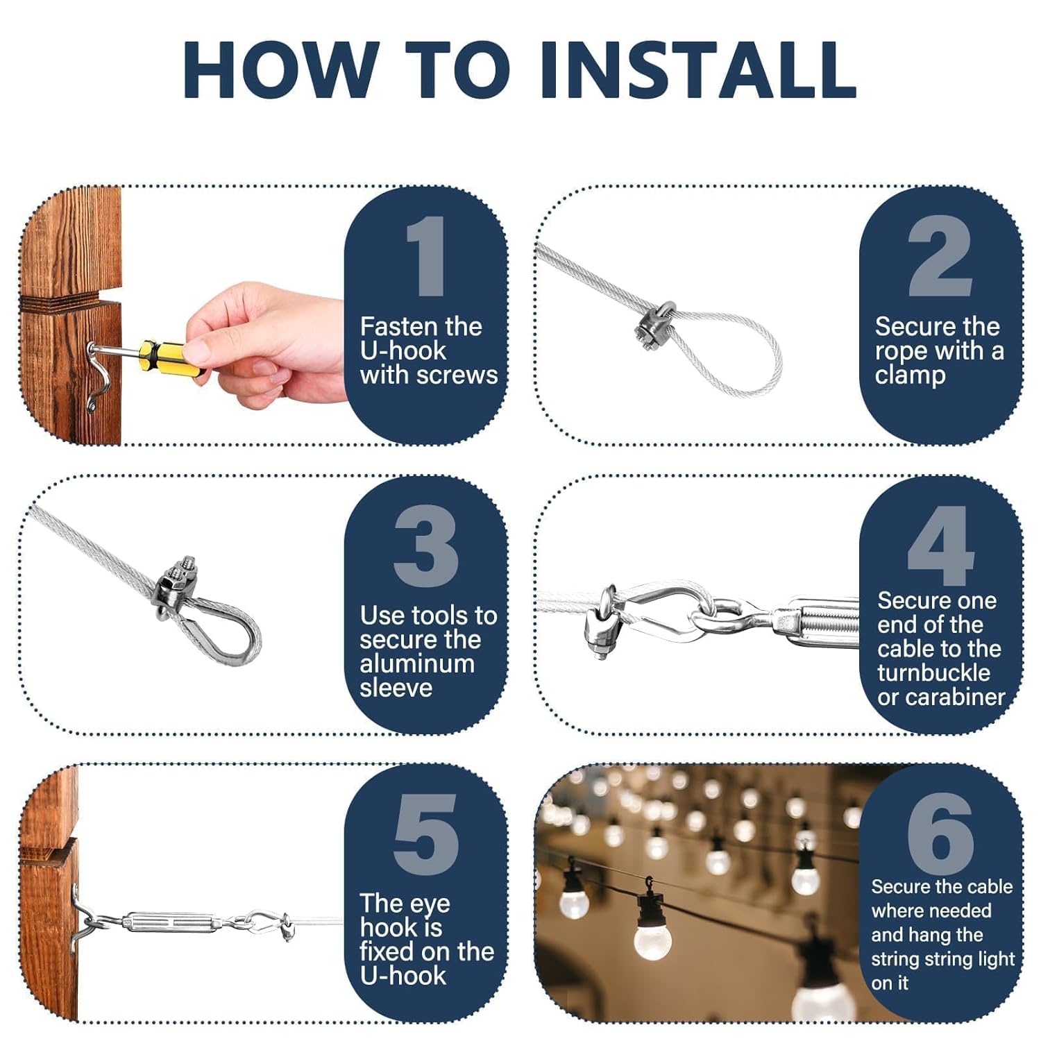 - Complete 3/16" Wire Rope Kit: 165ft 3/16 vinyl coated wire rope, 5 M5 turnbuckles for cables wire, 20 M4 wire rope clamps, 10 M5 thimbles, 10 M5 Mount U Hook, 22 Iron Screws, 22 Wood Screws, 10 Plastic Anchors, 1 M8 Wrench. Perfect for DIYers needing reliable solutions for anchored shed, fencing, sunshade