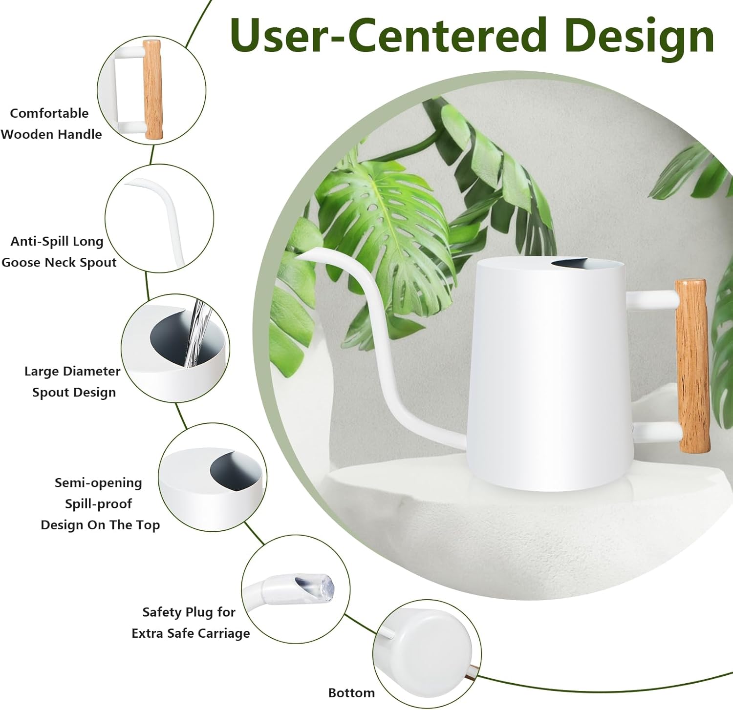 - Semi-opening Spill-proof Design & Comfortable Wooden Handle - Watering can for indoor plant with wide semi-opening on the top, can inject water quickly from the faucet. This stainless steel watering can built-in spill guard design on the top, you can watering your plants quickly without worrying about spilling. This watering can has a thick, natural wood handle that is easy to hold and won't slip out of your grip. Make watering your houseplants easy and enjoyable