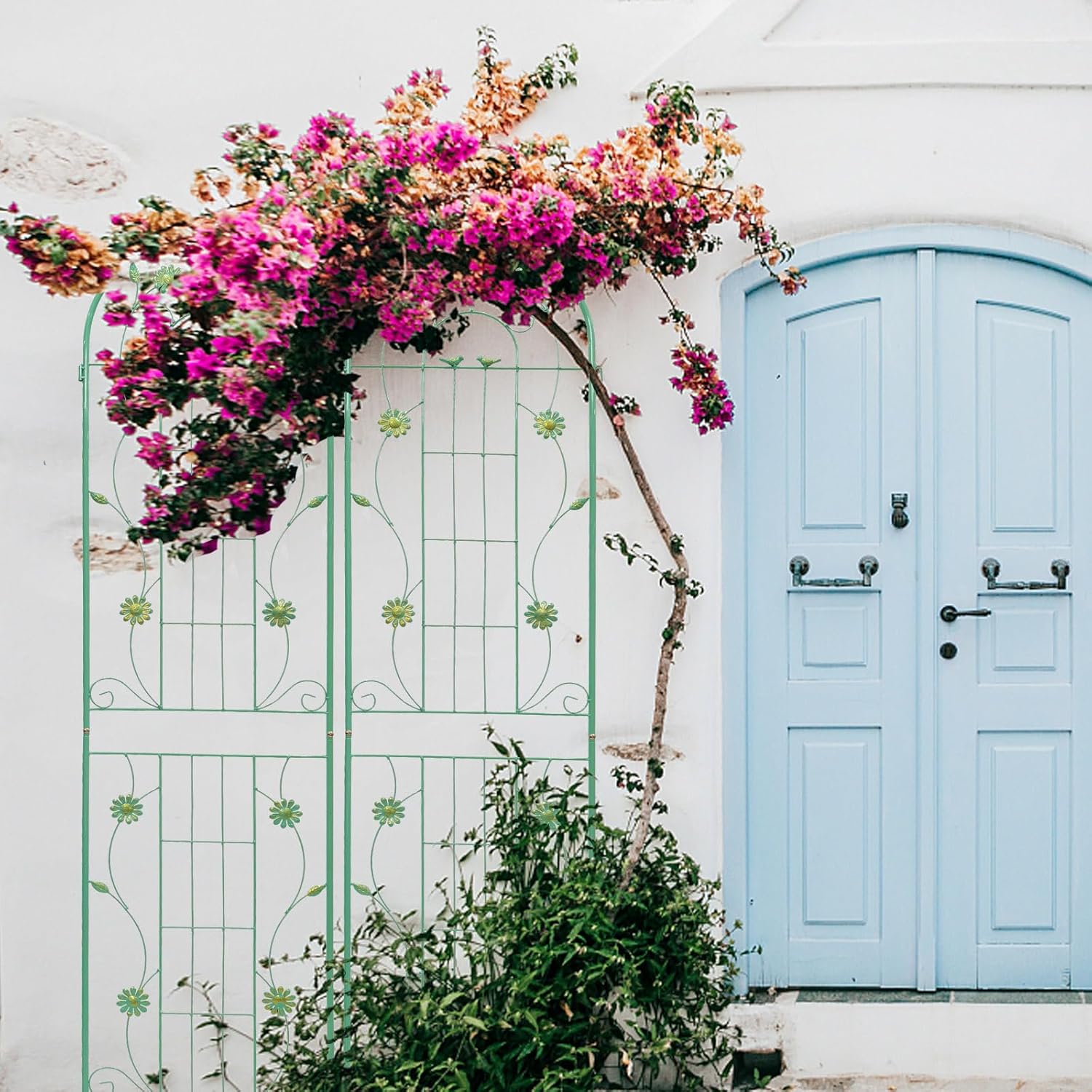 - PLANTS SUPPORTING TRELLIS: This blue green metal garden trellis is perfect for supporting all kinds of flowering trellis plants, wall-climbing vines. It allows them to grow naturally up towards the top.