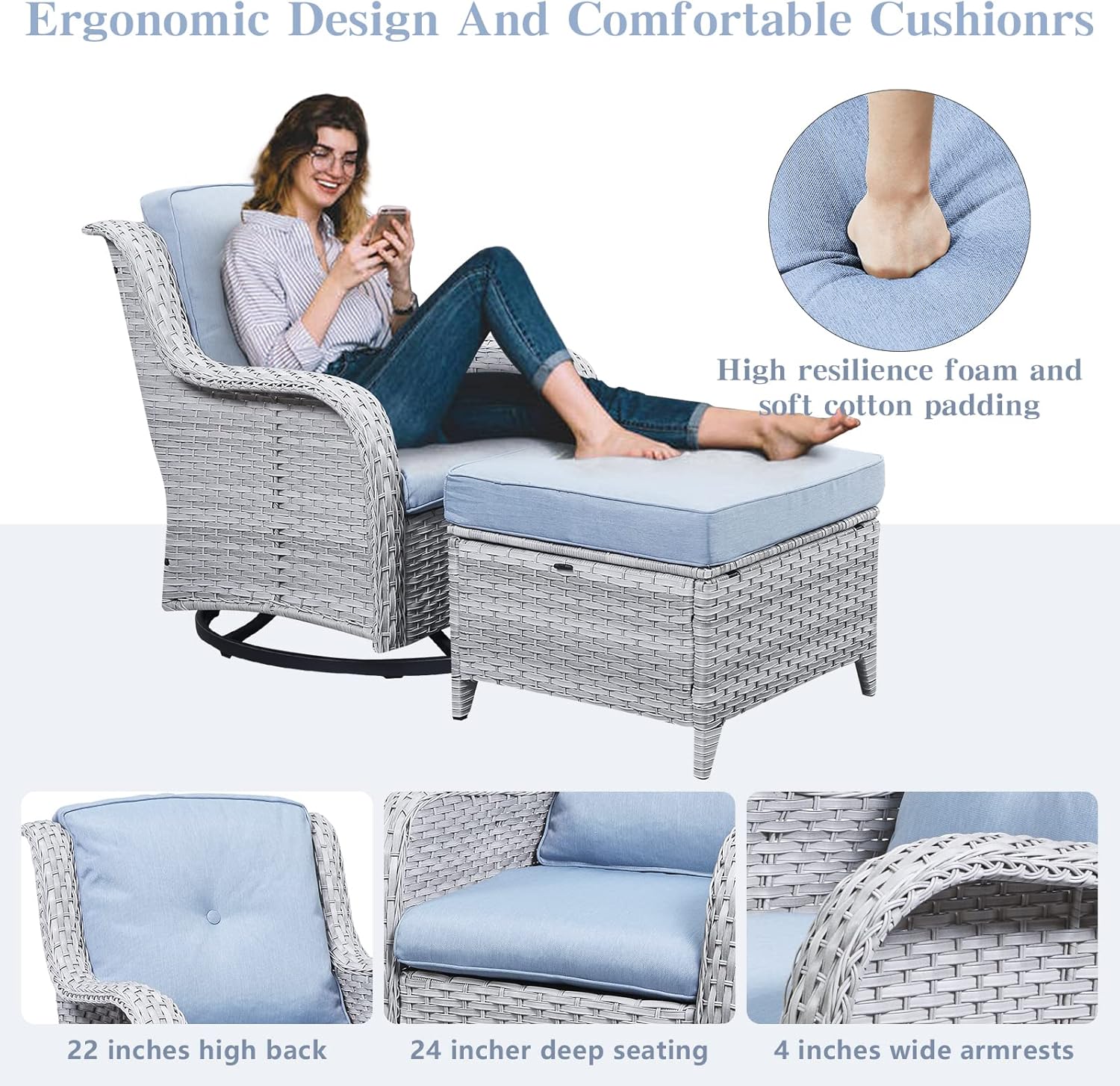 - 【Comfortable And Easy To Clean】Each swivel glider chair and wicker sofa in this outdoor furniture set comes with a 4-inch thick foam seat cushion and an 8-inch thick cotton back cushion, which is ergonomic and enhances the overall comfort of the chair. The patio wicker chair cushion cover is made of outdoor professional olefin fabric which is water resistant, and the seat cushion is equipped with zippers that are removable and easy to clean.