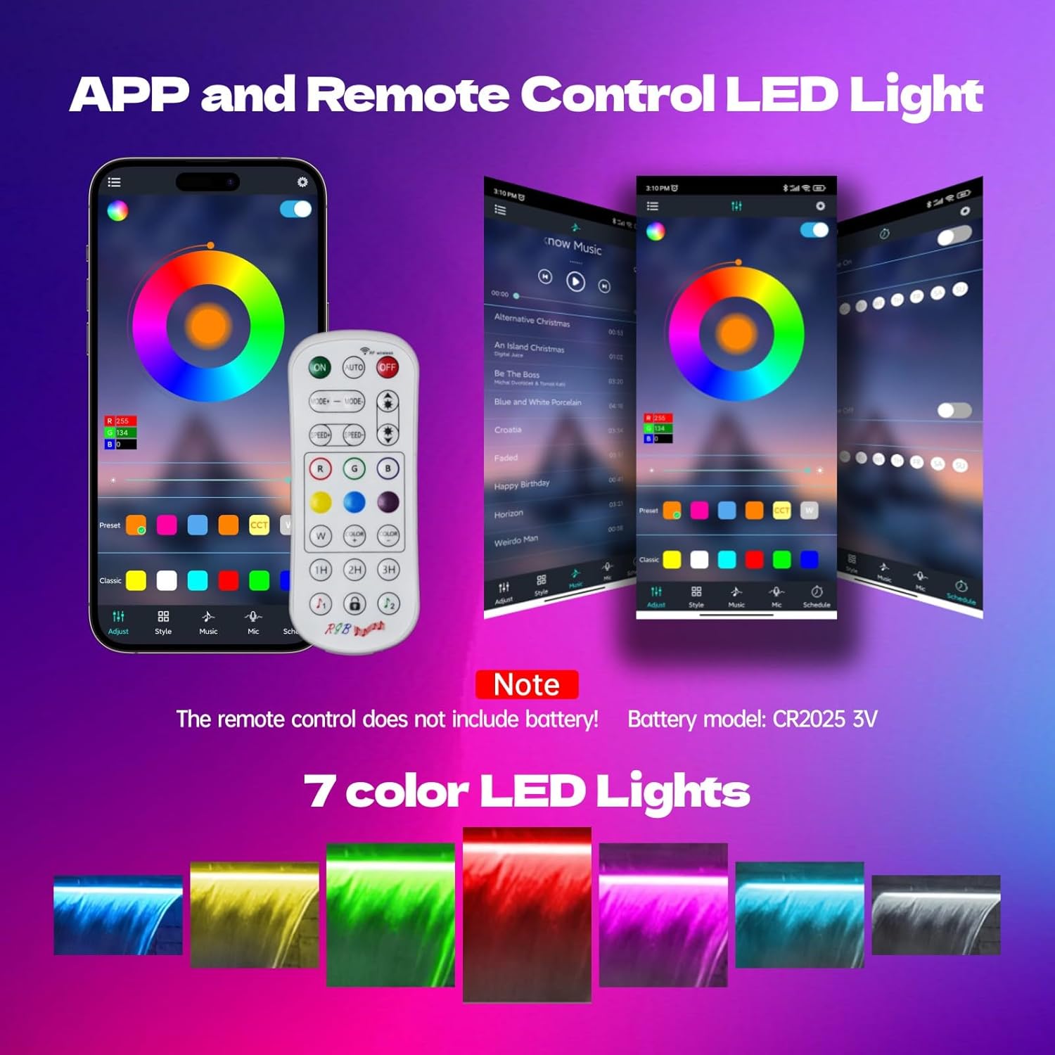 - ⏩App Control Waterproof Lights⏪ Pamopamo pool fountain is equipped with a waterproof LED light strip which can change multi colors via the RF remote or APP control. You can experience different modes through the mobile app, such as music mode, light mode, voice mode, etc.(Remote control do not include battery)