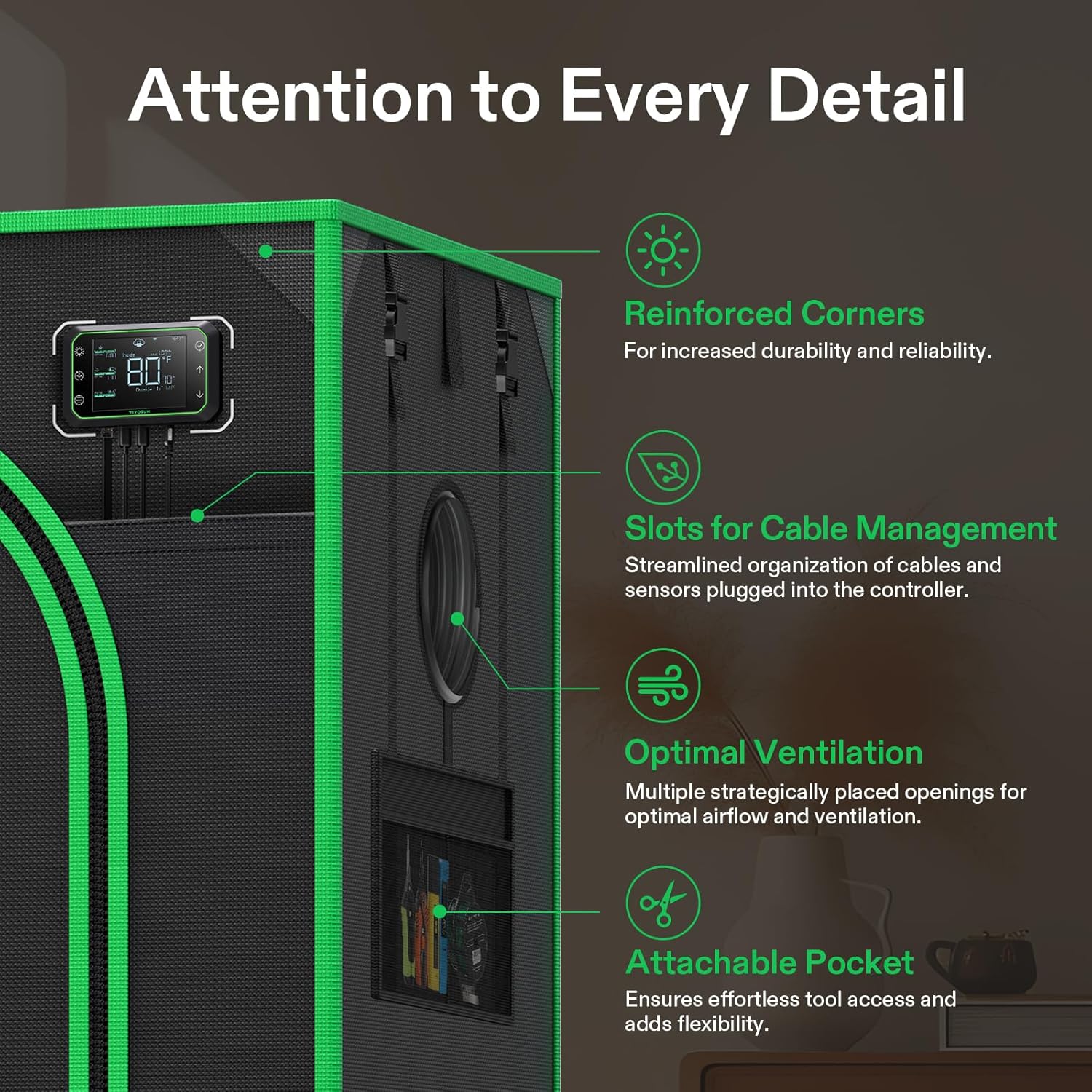 - Upgraded Lightproof Fabric: Durable 2000D Oxford canvas lined with plant-friendly PE and 100%-reflective Mylar; The three-layer thick fabric ensures zero light leaks, boosting the output efficiency of your setup; Zipper section is designed with black inner lining for enhanced light prevention